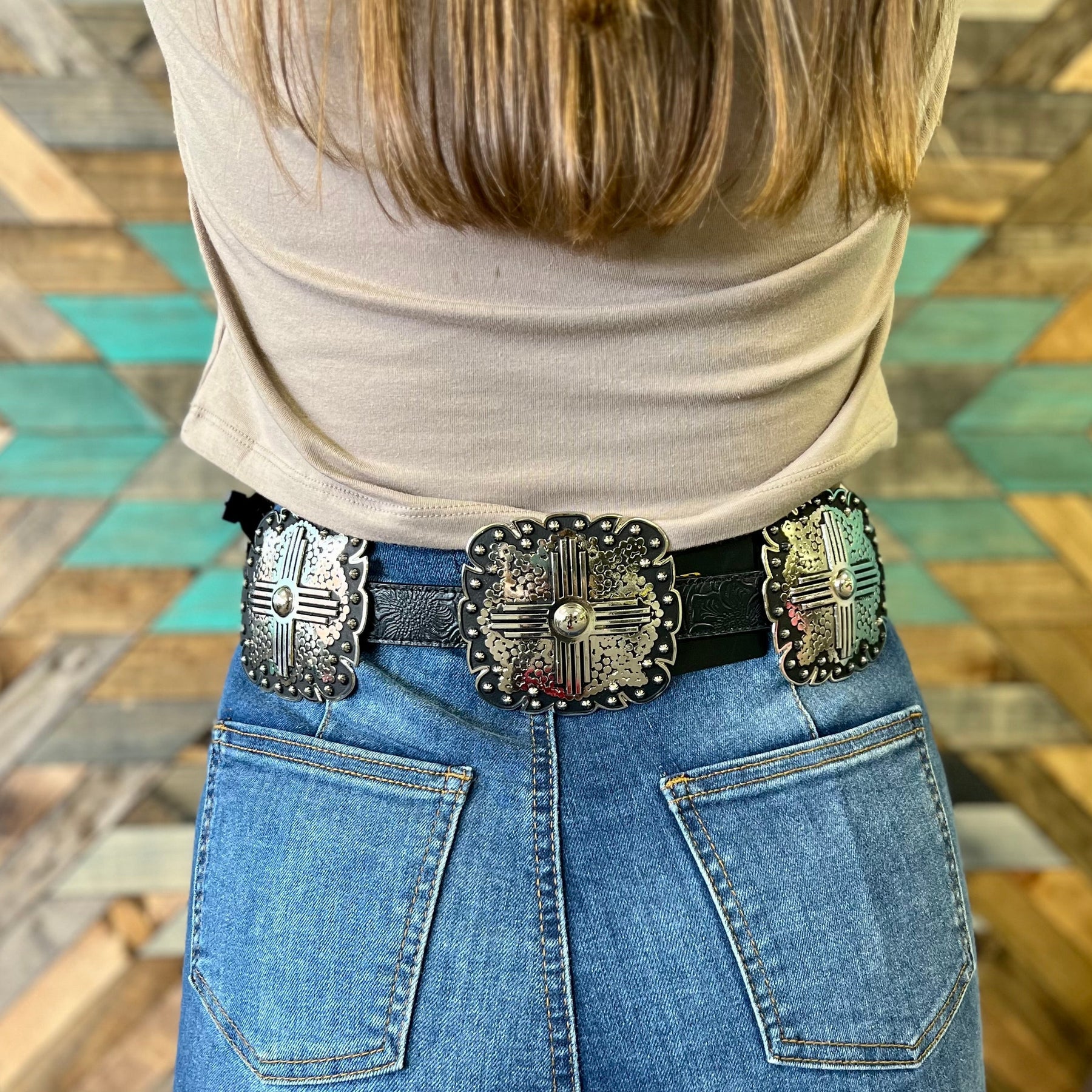 The Bullhead City Belt is a Beautiful 3 1/2" X 3 1/2" square buckle design all the way around. The belt has 5 square buckle conchos and the buckle to match. The black belt is a 1" floral tooled belt. This belt is beautiful on.