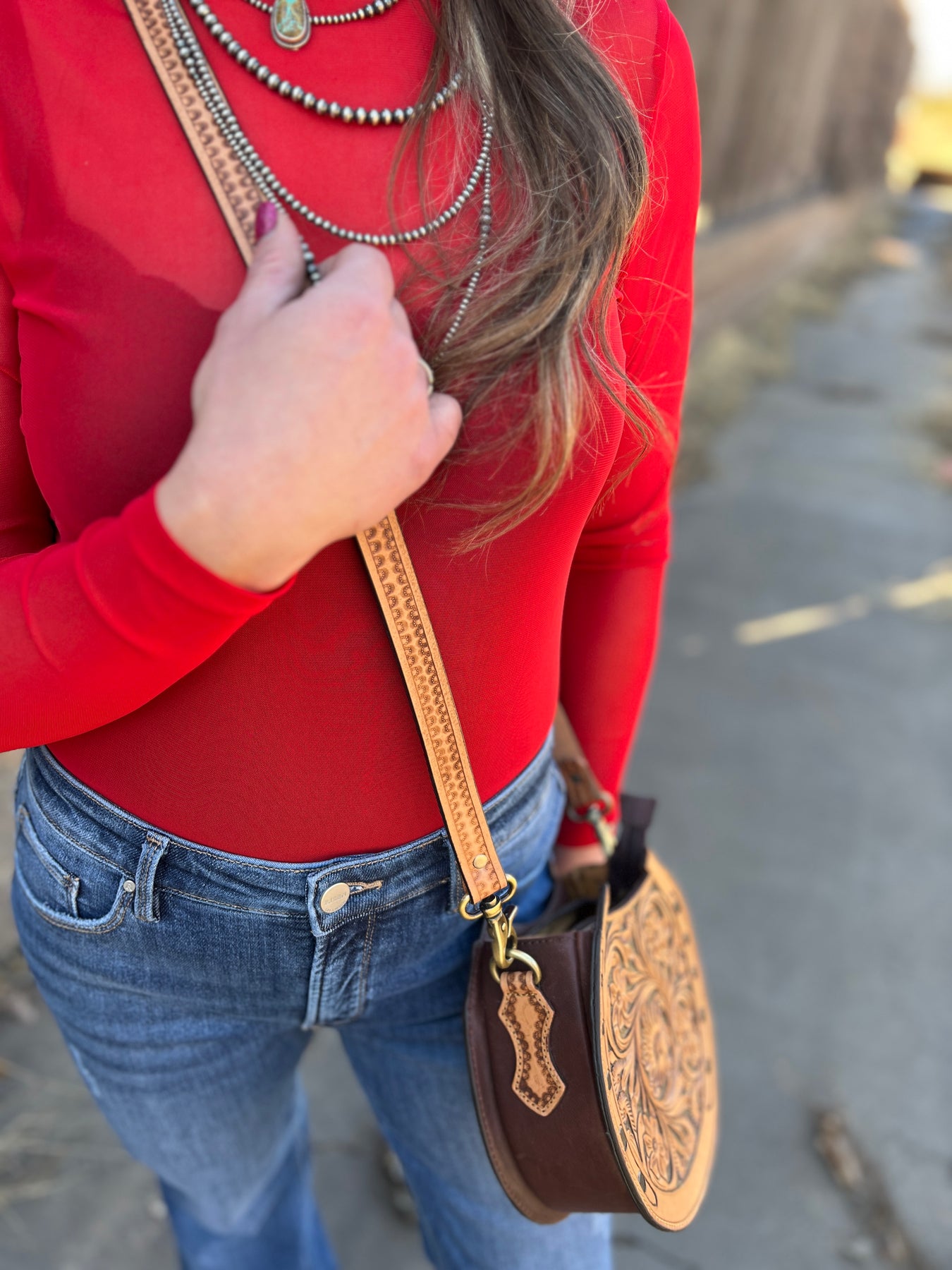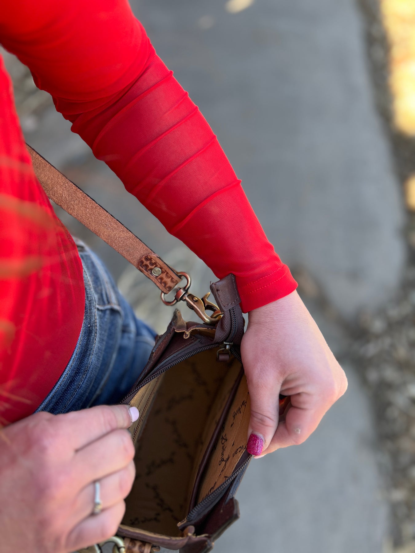 Elevate your style with the American Darling Tooled Horse Shoe Bag. Crafted from high quality tooled leather, this bag features a unique horse shoe shape that exudes luxury and sophistication. The spacious single compartment and removable shoulder strap add practicality to its western-inspired design. Choose between a shoulder strap or crossbody wear for effortless versatility.