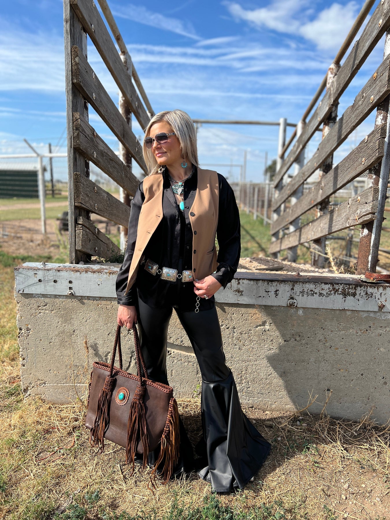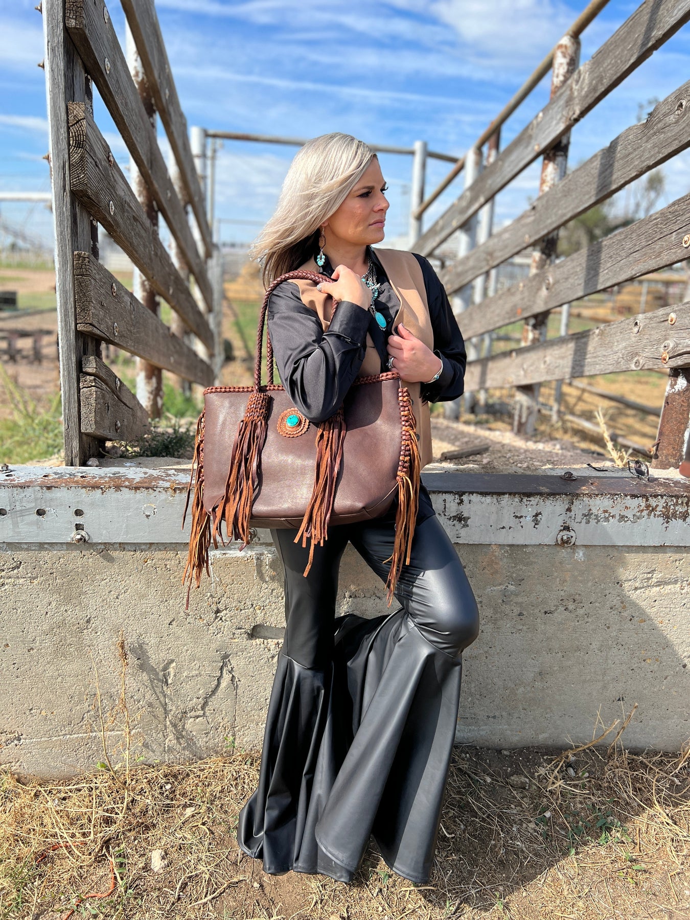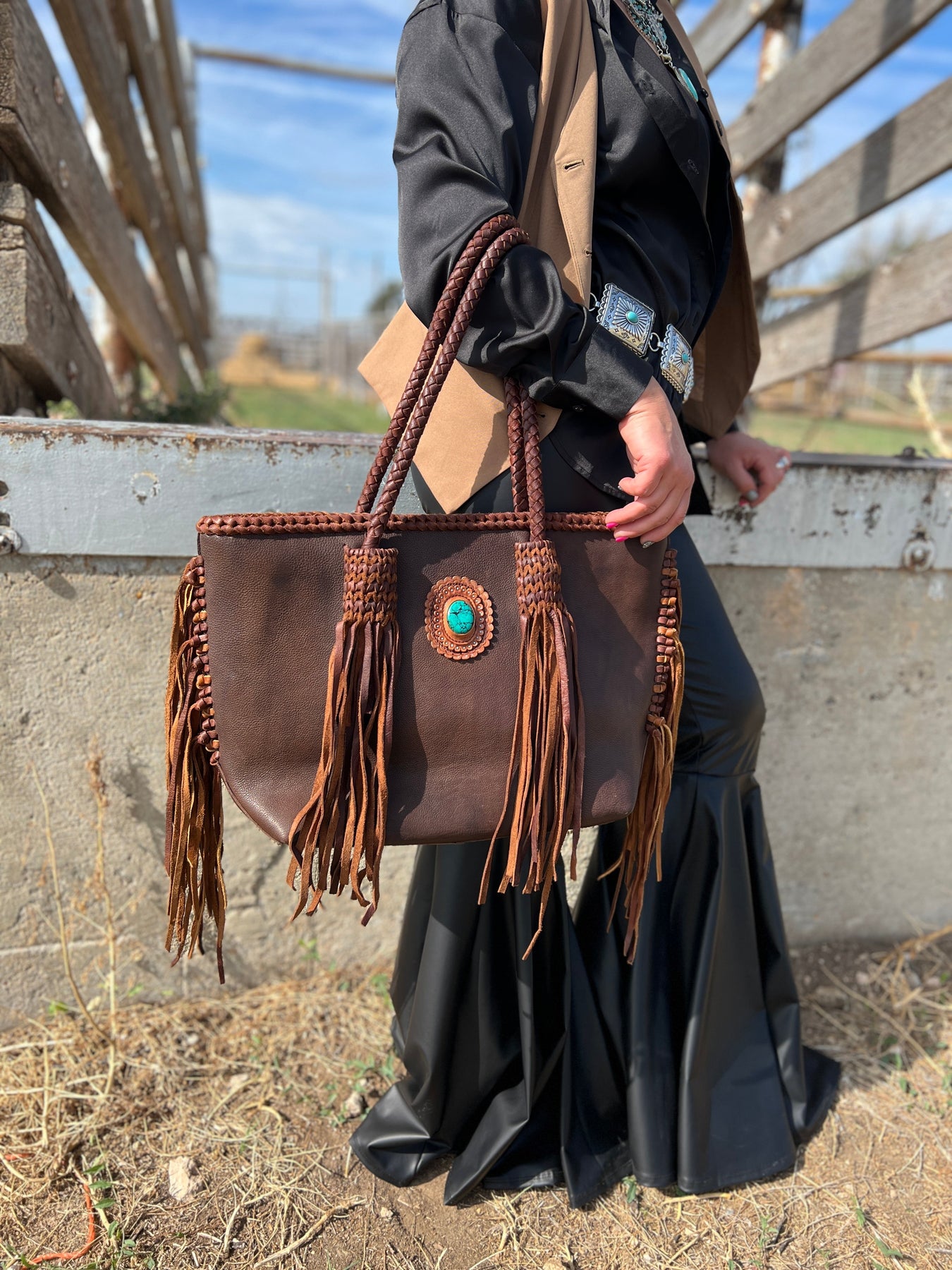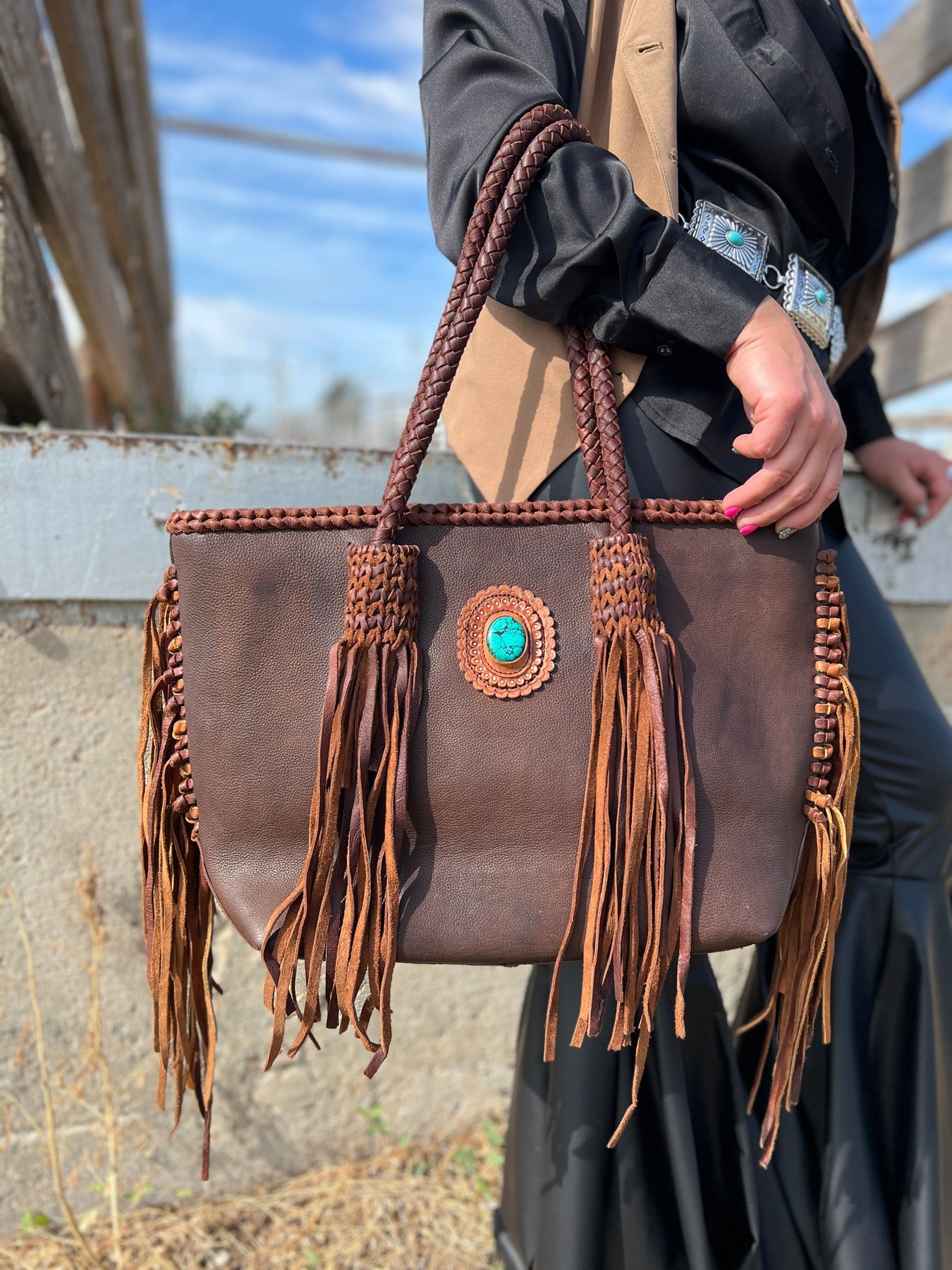 Introducing the Darling Packs A Punch Bag - a high-end western fashion statement! This gorgeous leather bag features braided handles with fringe and a bold turquoise stone. Its superior quality and stunning design will make you stand out in any crowd. Upgrade your style with this must-have accessory!