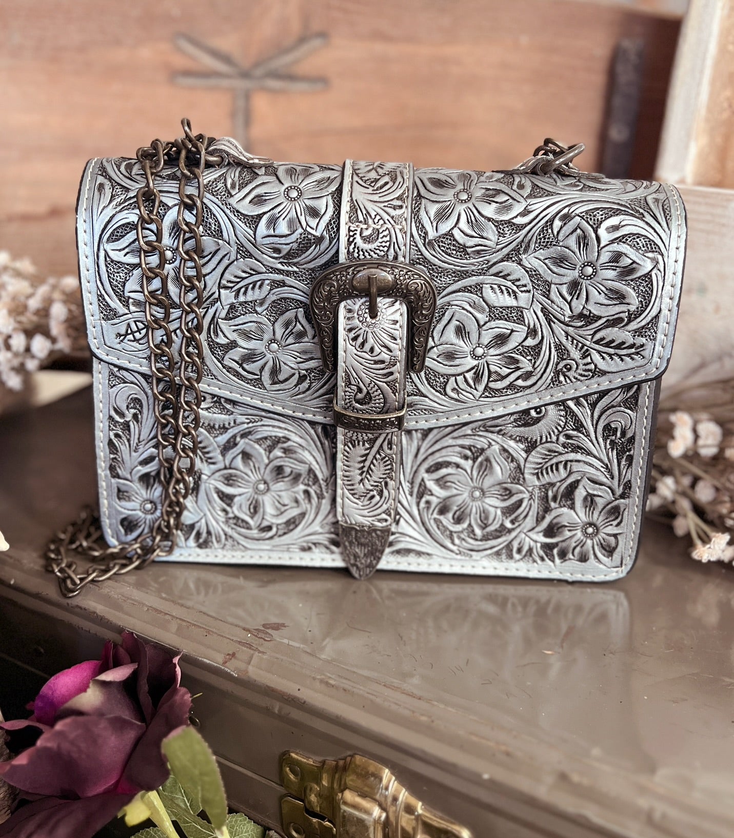 Elevate your style with our Darling Tooled Leather All-Around Belt Buckle Bag. Crafted with 10" length, 6.5" height, and 3.5" width, this bag is perfect for carrying your daily essentials. Its adjustable chain strap (24"-45") offers versatility, while the floral tooled leather front and basket weave design add a touch of elegance. With 3 color options, you can easily find your perfect match.