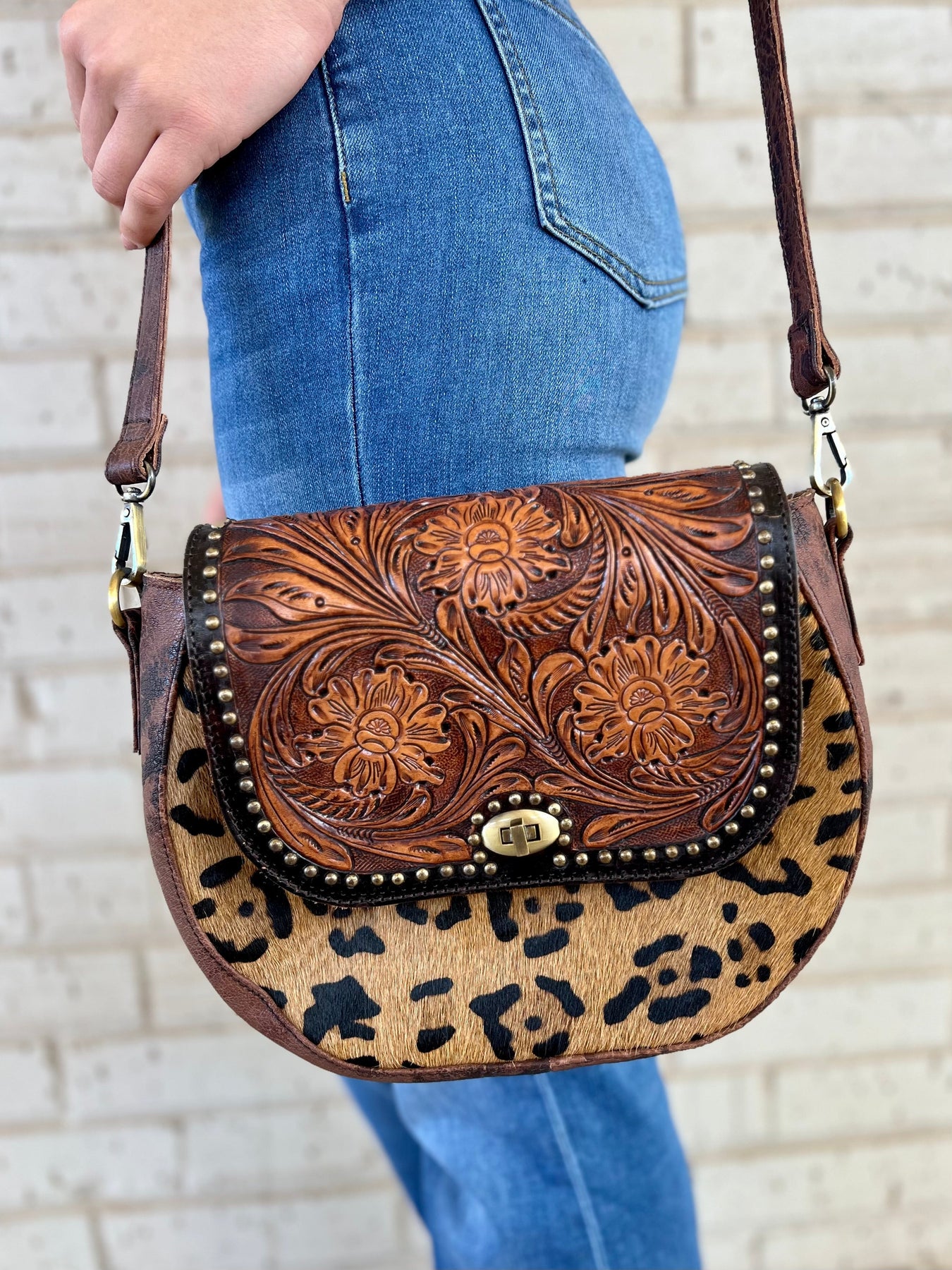 Make a statement with this unique leopard hair on hide bag. Crafted from tooled leather with floral tooled design and small nail head detail, it's as wild as it is stylish. With an adjustable/removeable strap, it can be a shoulder bag or clutch. Ready to hit the plains? Go wild with this must-have bag. 12" X 9" in size