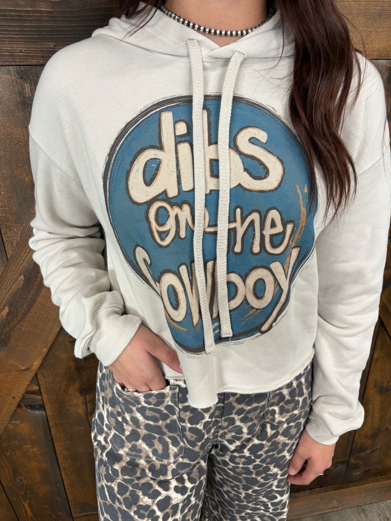 Stay cozy and stylish in this greyish taupe cropped hoodie, perfect for those who want to say "Dibs On The Cowboy" with flair. Made from 100% soft cotton, its long sleeves and playful graphic make it a fun staple for casual days and cool evenings. Pair it with high-waisted jeans for an effortlessly cute look that’s ready for any adventure.