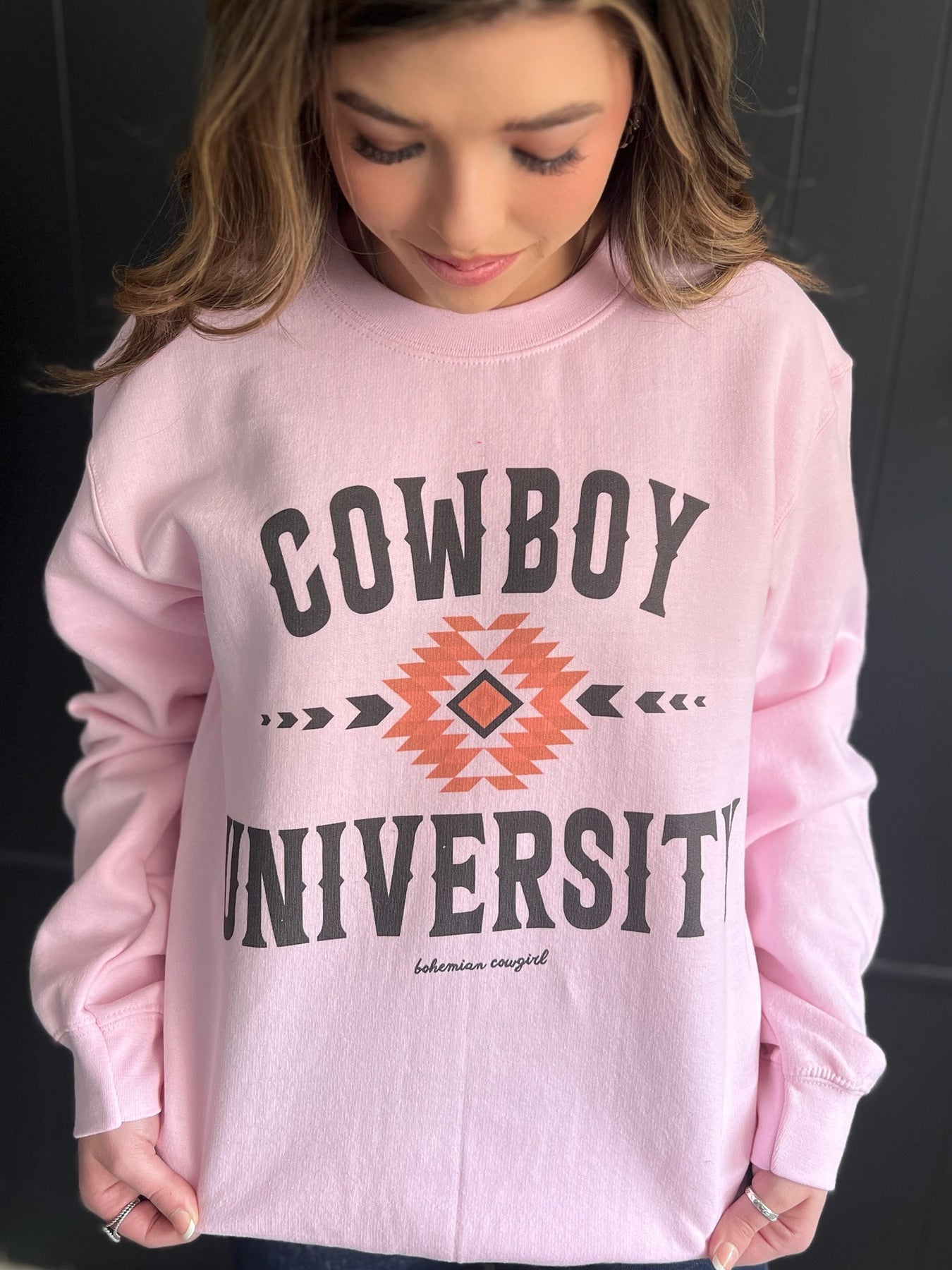 Experience luxury and comfort with our Pink Cowboy University Sweatshirt. This light pink crewneck is super soft, perfect for those chilly nights. Adorned with a southwestern aztec design and the prestigious "Cowboy University" print, it's a trendy and sophisticated addition to any wardrobe.