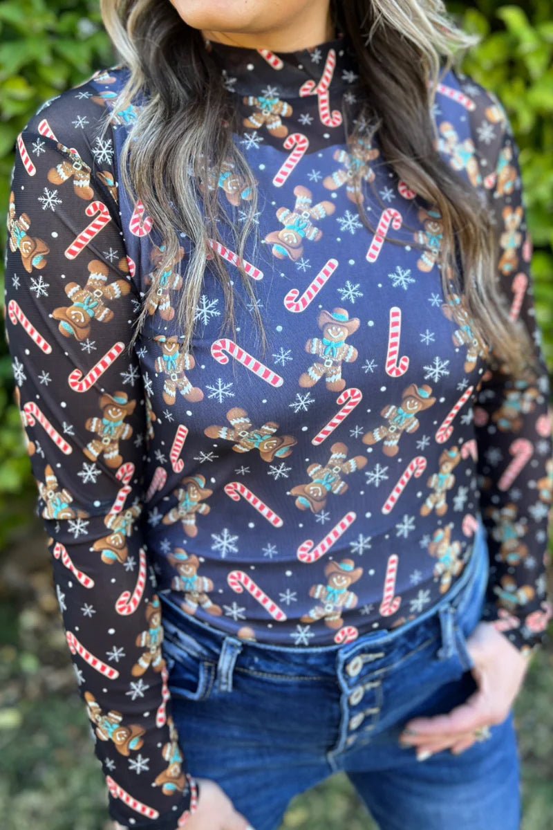Get in the festive spirit with our Candy Cane Kreek Mesh Top! Adorned with snowflakes, candy canes, and a gingerbread man cowboy, this cute and stylish top is perfect for the holiday season. The mesh material adds a touch of allure, making it a must-have for any holiday event.