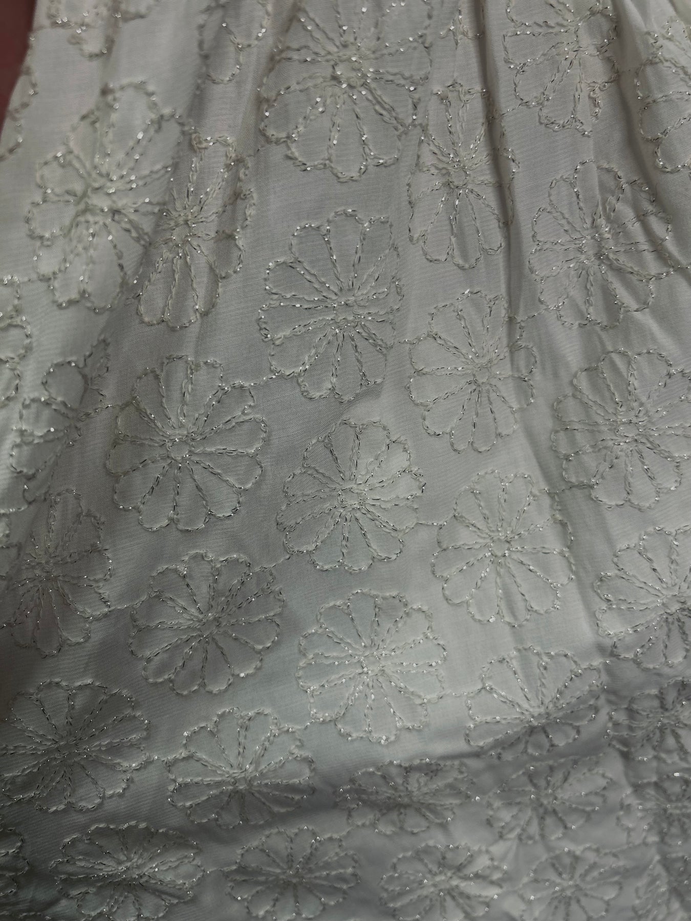 This white floral dress is made with high quality material and features subtle embroidered flowers. The deep v-neck and ruffle hem add elegant and timeless elements to the sweet style. Complete with a tie back and cut out, this dress is perfect for any occasion. Modesty slip dress sewn in.