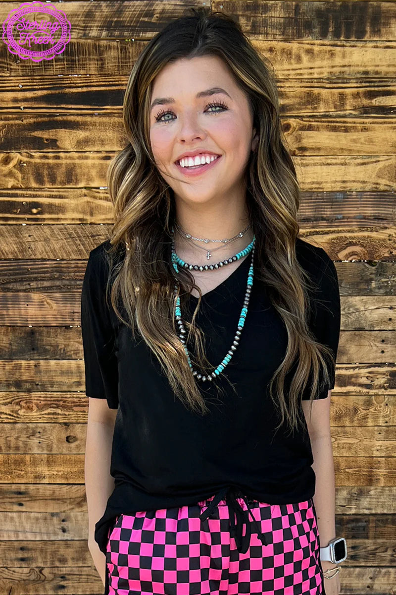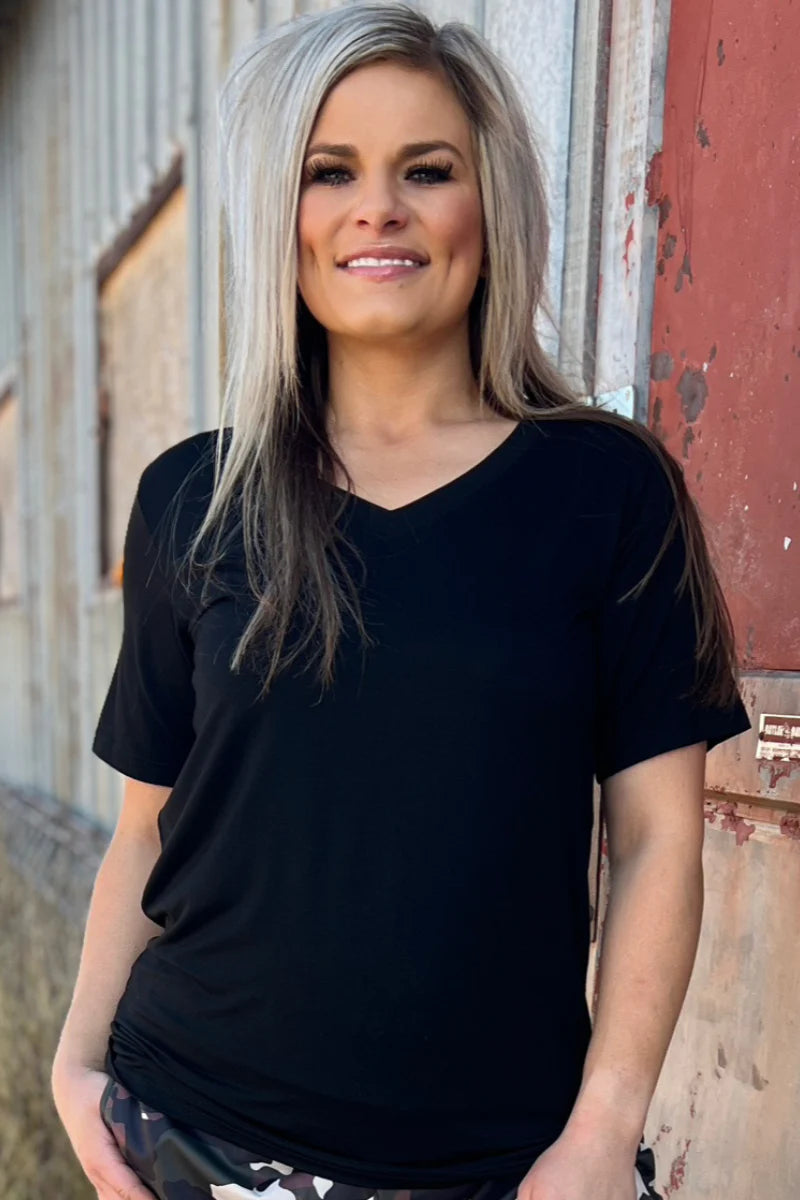 This simple black tee is perfect for any occasion, dressed up or down! With the silky soft material, and the size accommodations, you'll be wearing a smile with it too! This tee has a flattering V-Neck, short sleeves, and a straight hem along the bottom.