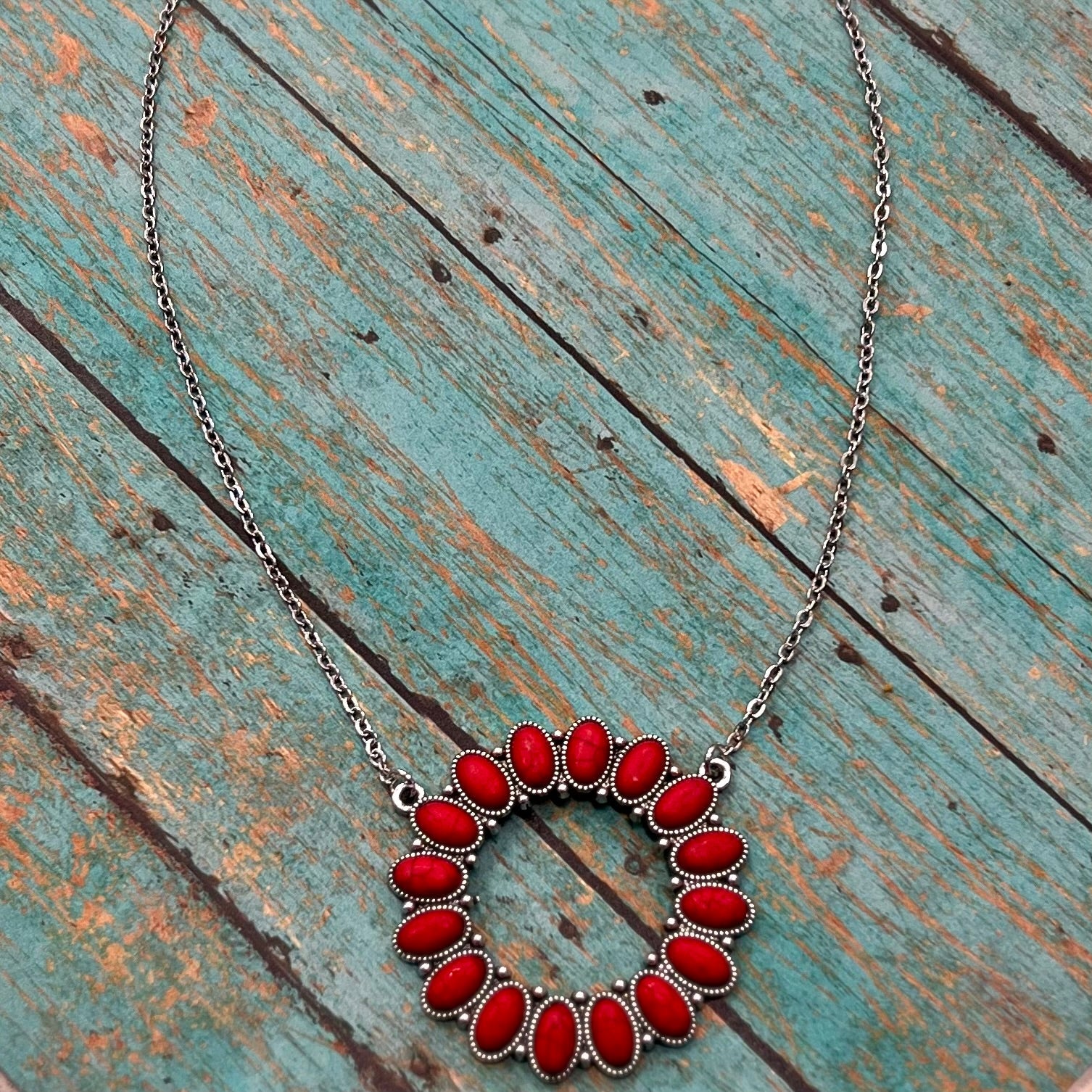 Step into the wild west with our Ring of Fire Necklaces! This stylish open pendant necklace features a unique 'ring of fire' composed of natural stone in beautiful shades of red and pink. With one of these showstoppers hangin' off your neck, you'll be ropin' in compliments left and right! So gallop on down and saddle up with this sizzlin' western look!