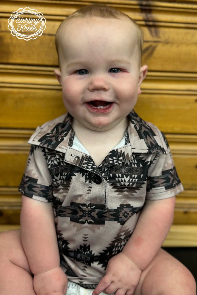 Add a touch of western charm to your child's wardrobe with the Sterling Kreek Mini Maui Island Polo Shirt. This kid's and babies polo shirt features a black, grey, and white aztec print and a collared design. Made from cool and comfortable fabric, it's perfect for both work and play. Yee-haw!