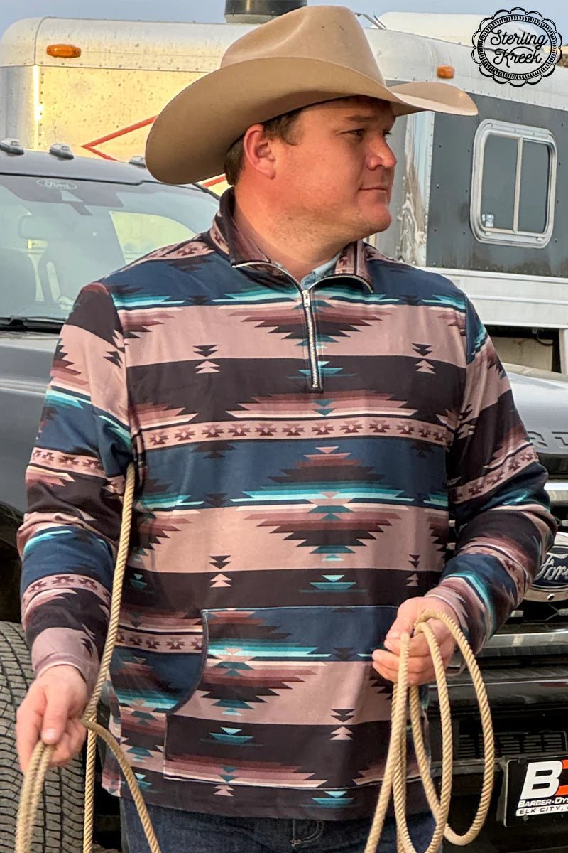 Introducing the DAKOTA HILLS PULLOVER, the perfect addition to any wardrobe. This aztec quater zip pullover boasts a unique blend of dark blue and tan colors, giving it a playful yet stylish look. Stay warm and make a statement with this quirky and fun addition to your closet.