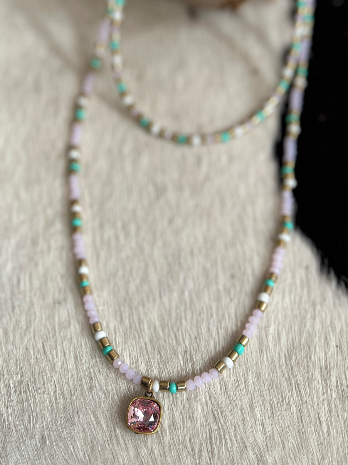 Rule over any outfit with the Panache Pink Princess Necklace. Made with gold, light pink, and light green beads, this double stranded beauty comes in 12" and 18" strands. With a Dainty pink 1/2" pink dangle stone. Simply stunning!