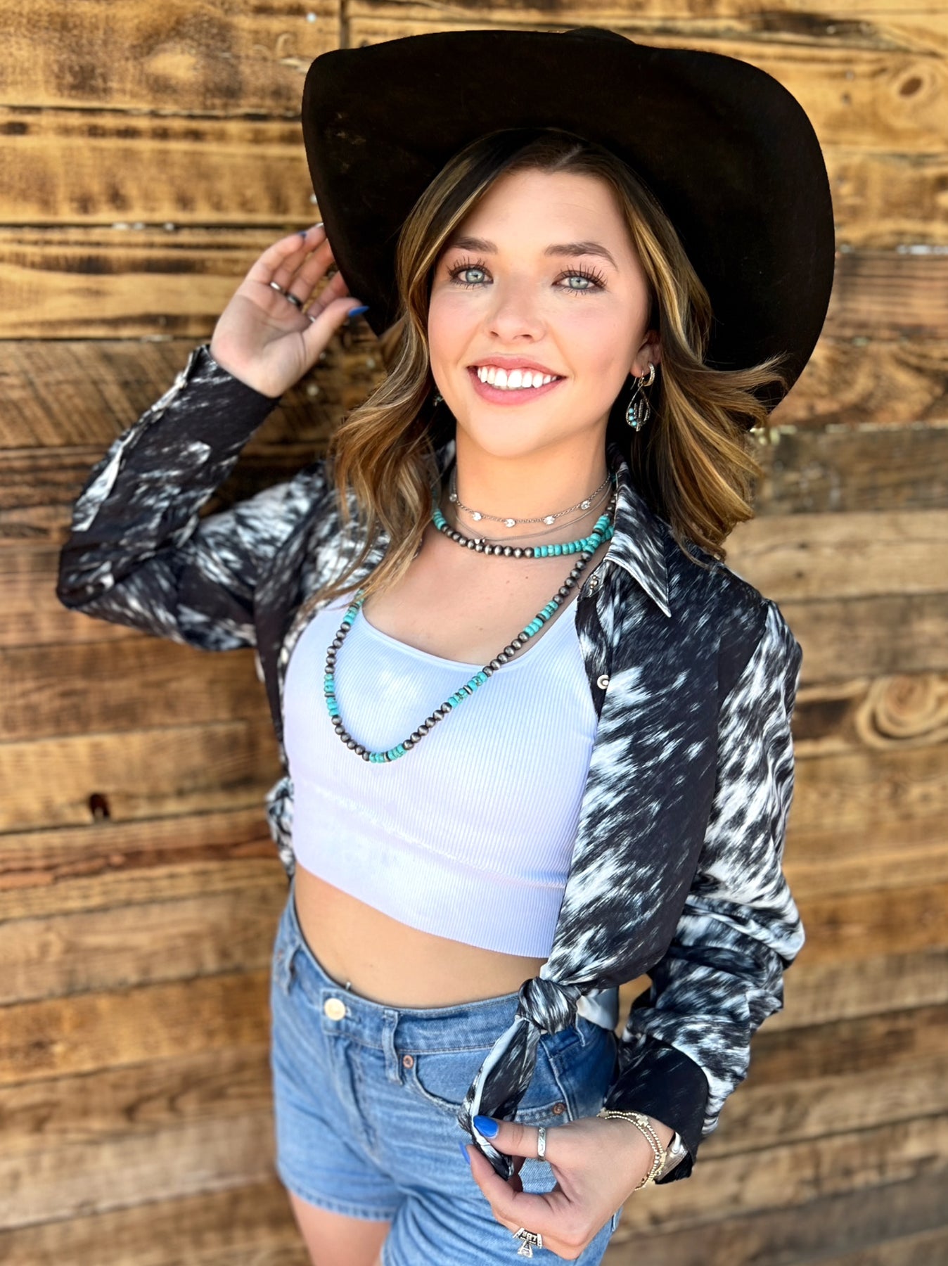 Yeehaw! Wrangle in some style with the Lets Get Western Button Up. This cowhide print button up adds some rustic flair to any outfit, perfect for a night out at the rodeo or a casual day at the ranch. Don't be afraid to show your wild side with this unique and playful piece!