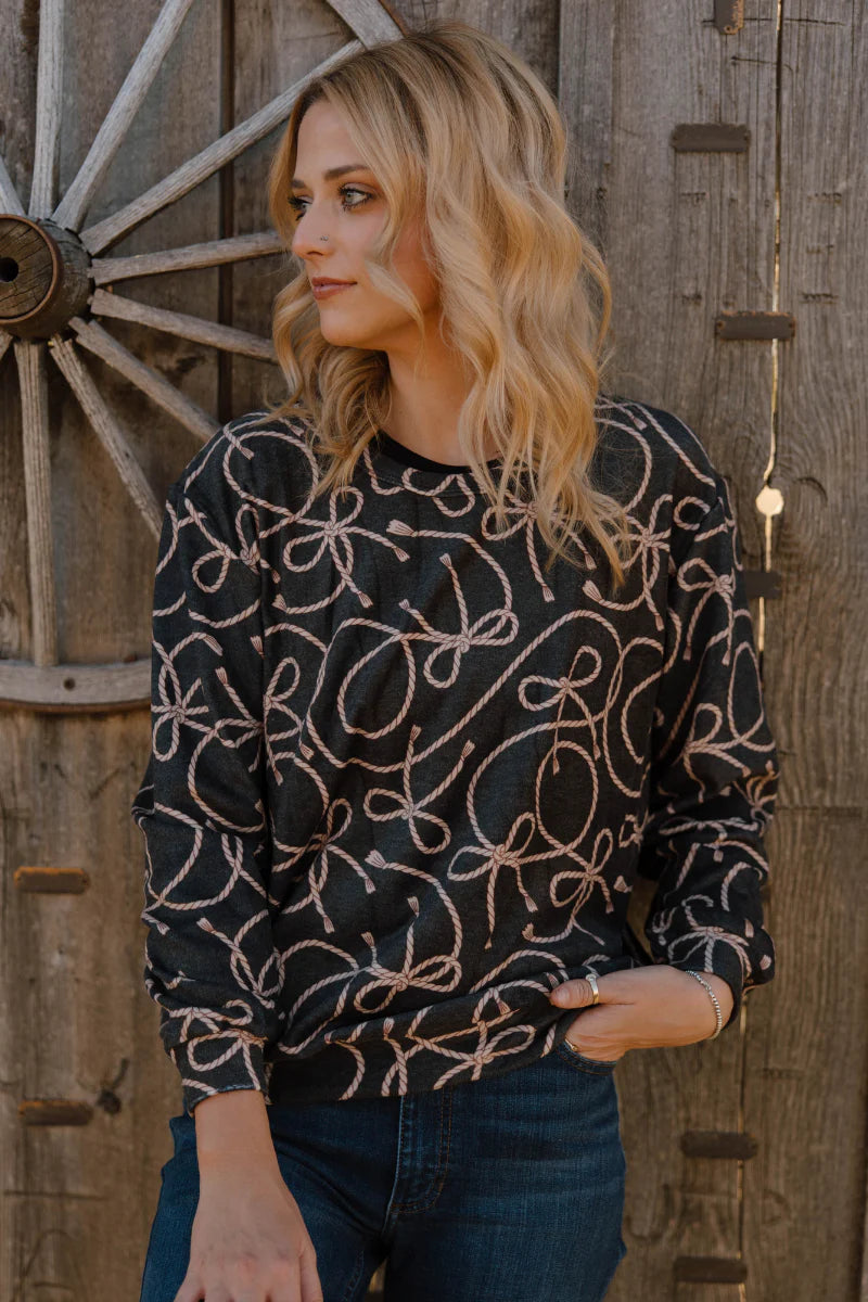 Add some fun to your look with the Rope Me In Top! This black beauty is playfully decorated with rope bows woven into a charming pattern, giving your outfit a whimsical twist. Perfect for mixing and matching, it’s sure to rope in compliments wherever you go.