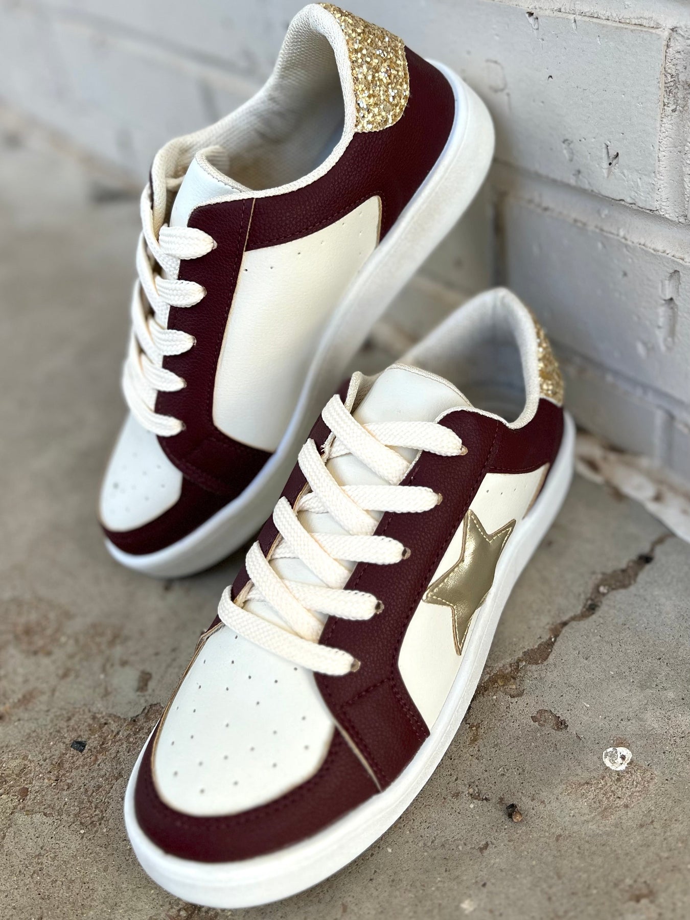 These Burgundy Game Day Sneakers will have you standing out from the rest! Featuring a white base sneaker with burgundy details, a gold star, and a sleek gold heel, these trendy shoes will keep you looking fly while giving you a comfortable and solid feel thanks to the rubber sole. Keep your style game strong!
