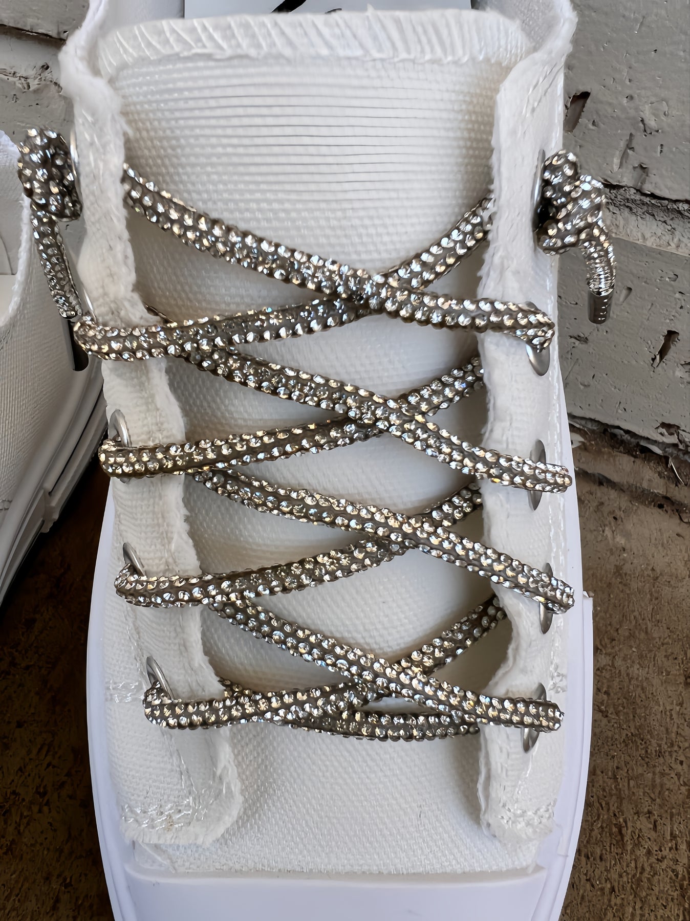 Elevate your style with our Can I Get An Aman White Sneakers! Designed for superior comfort, these low profile old school style sneakers feature a rubber sole and cushioned footbed for all-day wear. The silver rhinestone no-tie laces add a touch of elegance, while the elastic band under the tongue ensures a secure fit. Perfect for casual, stylish daily wear that's currently trending.