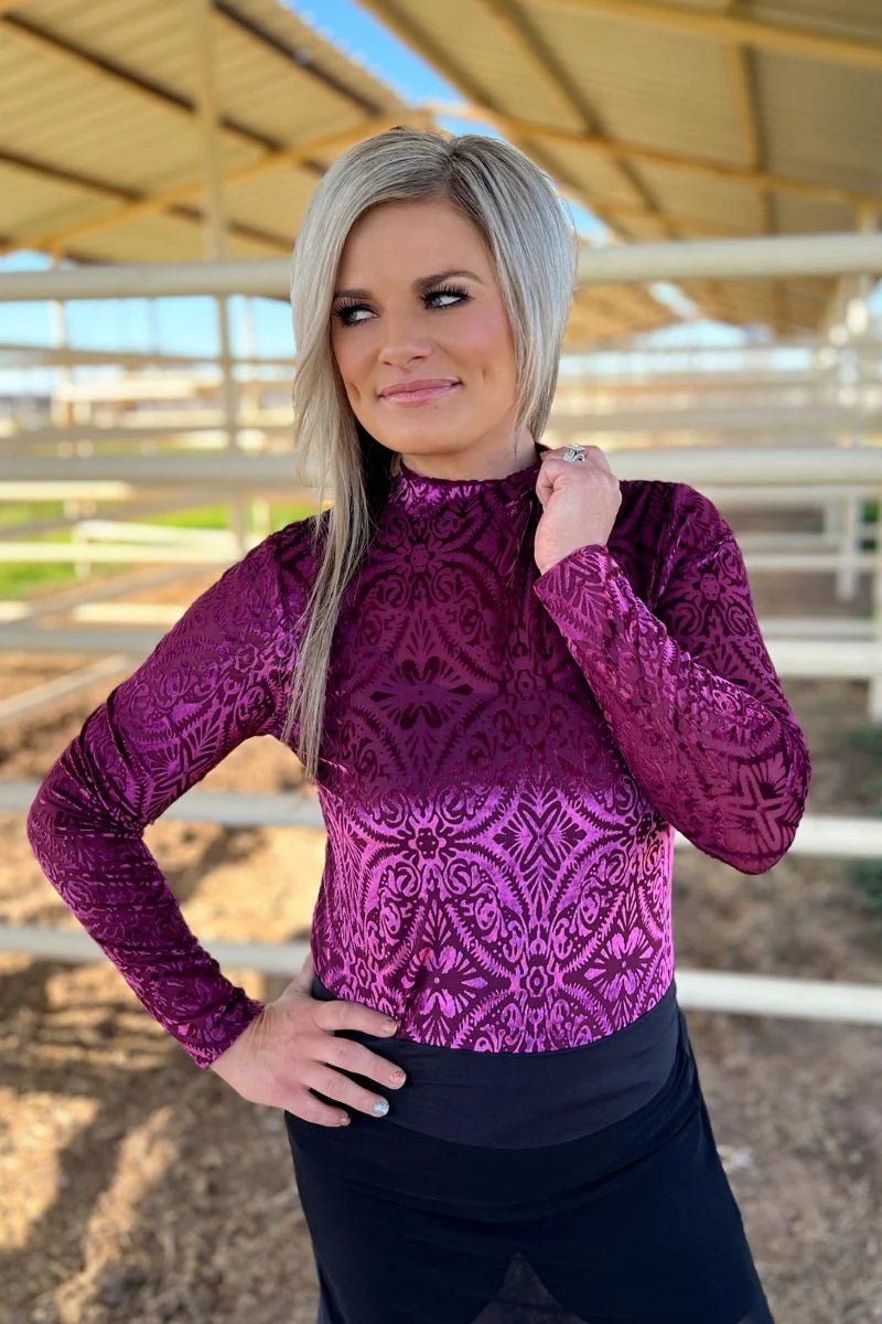 "Turn heads in this bold burgandy velvet design top with a high collar and long sleeves. The mesh material adds a touch of edge while keeping you effortlessly cool. Perfect for making a statement without trying too hard. (You might just cause a fashion earthquake in this Crater Lake top.)"