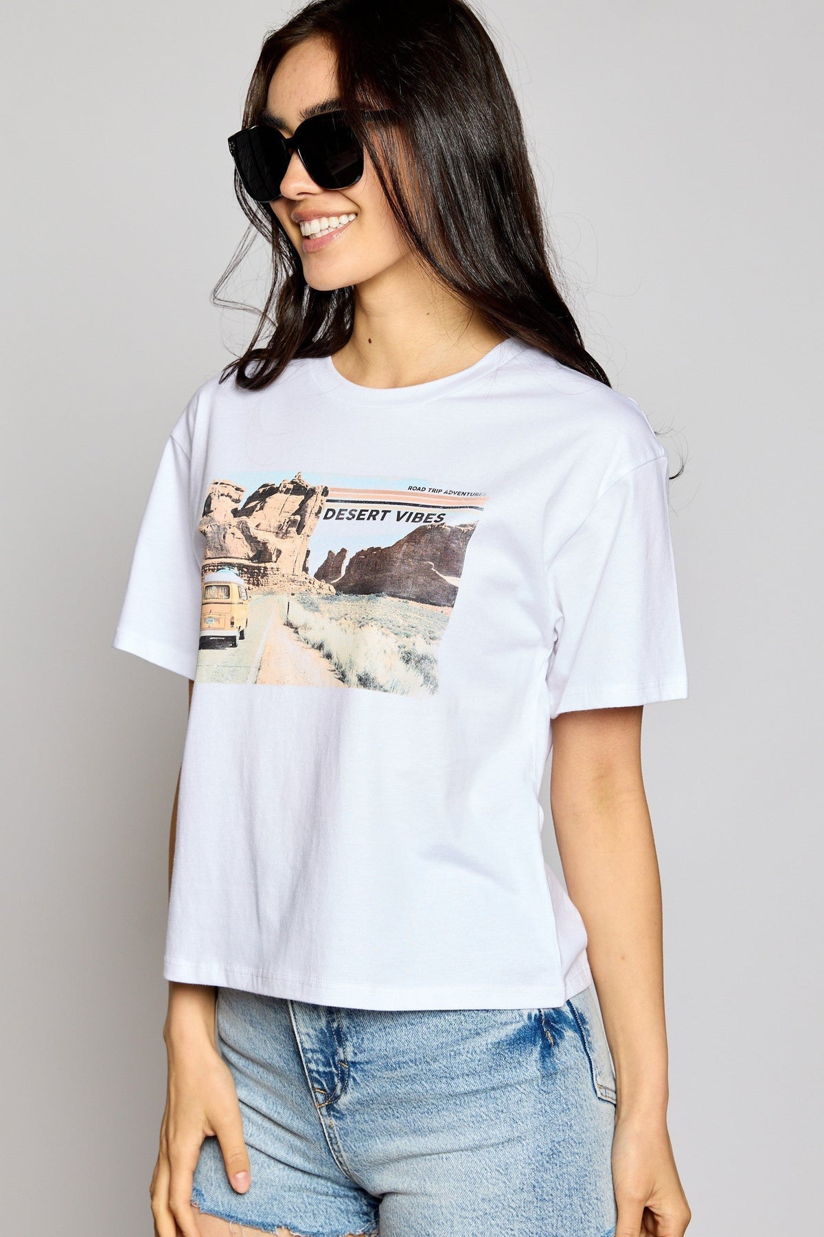 Hit the road with our Desert Vibes Road Trip Adventures Tee! This crop top was made for the adventurers looking for a wild ride. Featuring "DESERT VIBES ROAD TRIP ADVENTURES" printed on short sleeves, you won't need to worry about getting lost in the journey - you'll be rocking it all the way! Yee-haw!