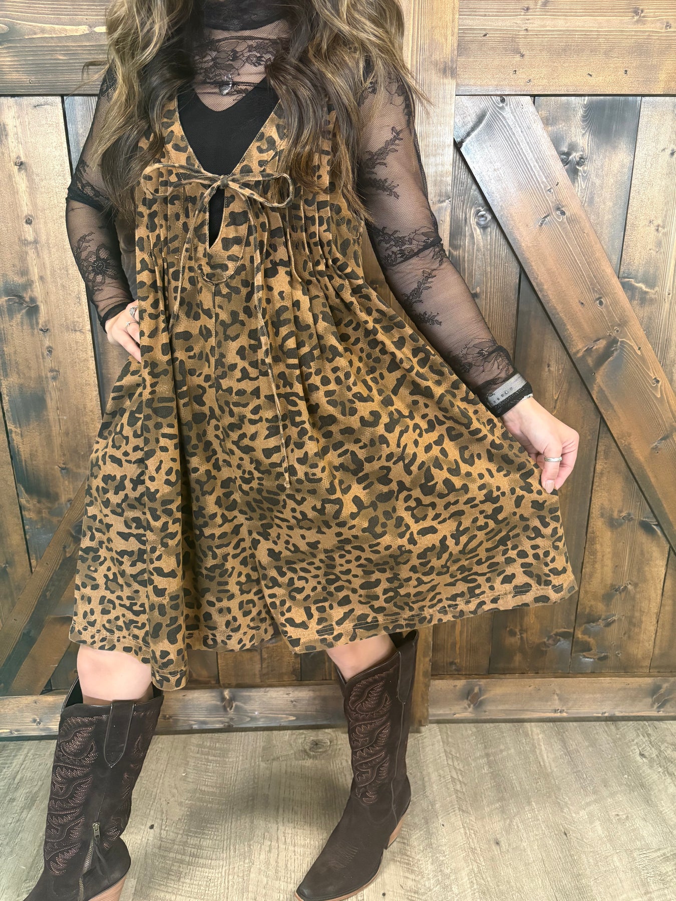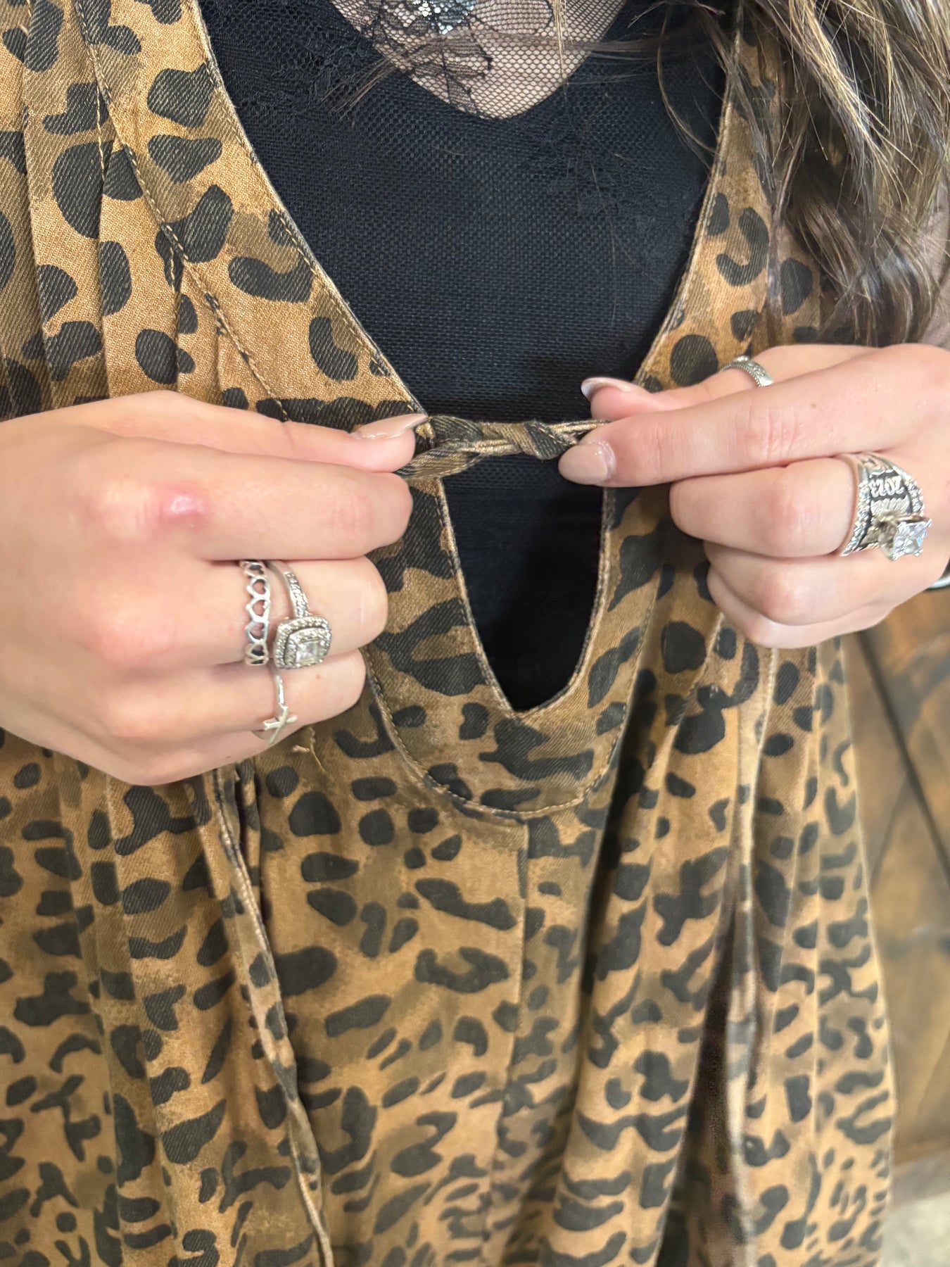 Step out in style with the L&B Leopard Print Denim Romper, featuring a playful leopard print on soft denim. This romper flaunts a flattering V-neck, convenient front pockets, and a charming front tie for an adjustable fit. The pleated design adds a fun, flirty touch perfect for warm days or casual hangouts. Ready to turn heads? This romper brings wild style with easy comfort.