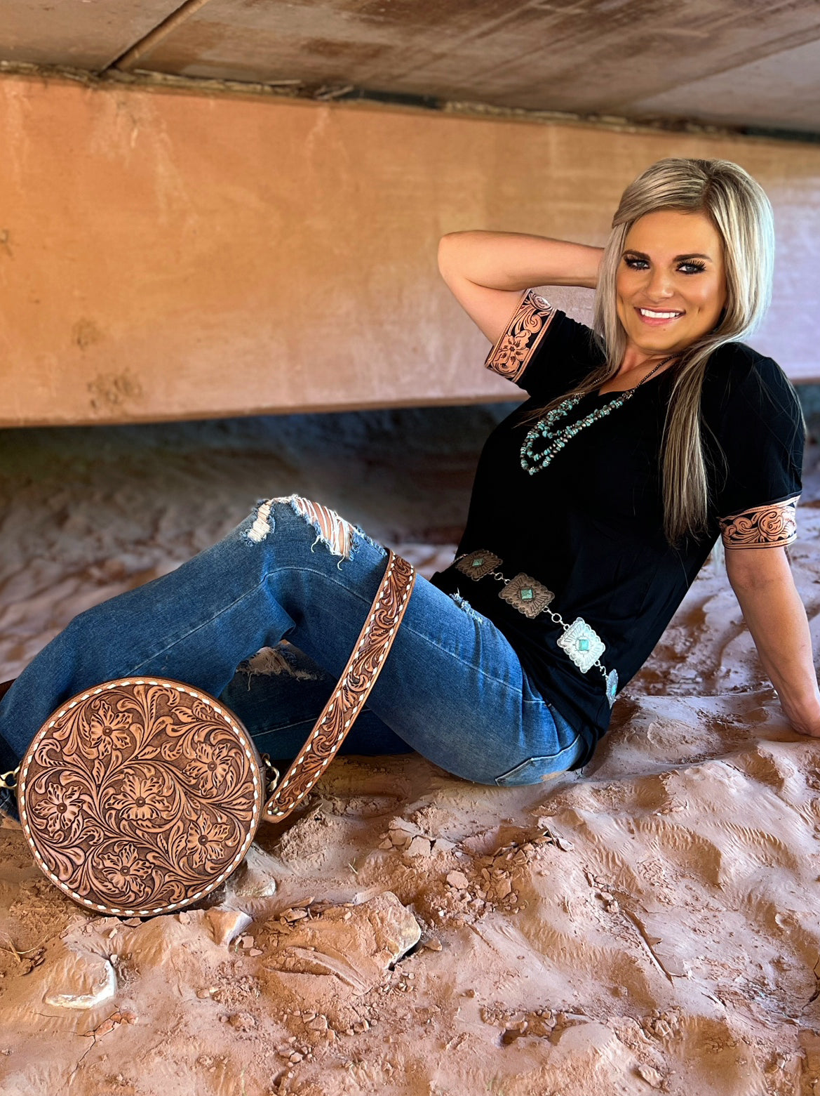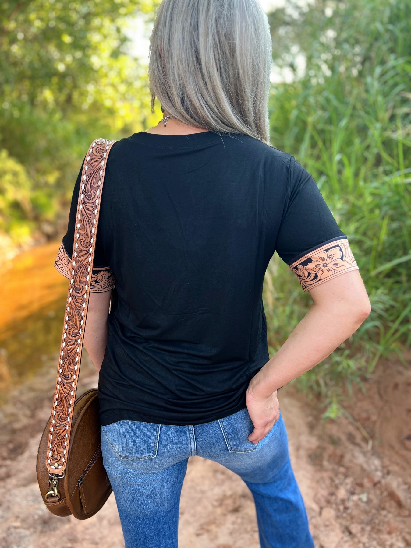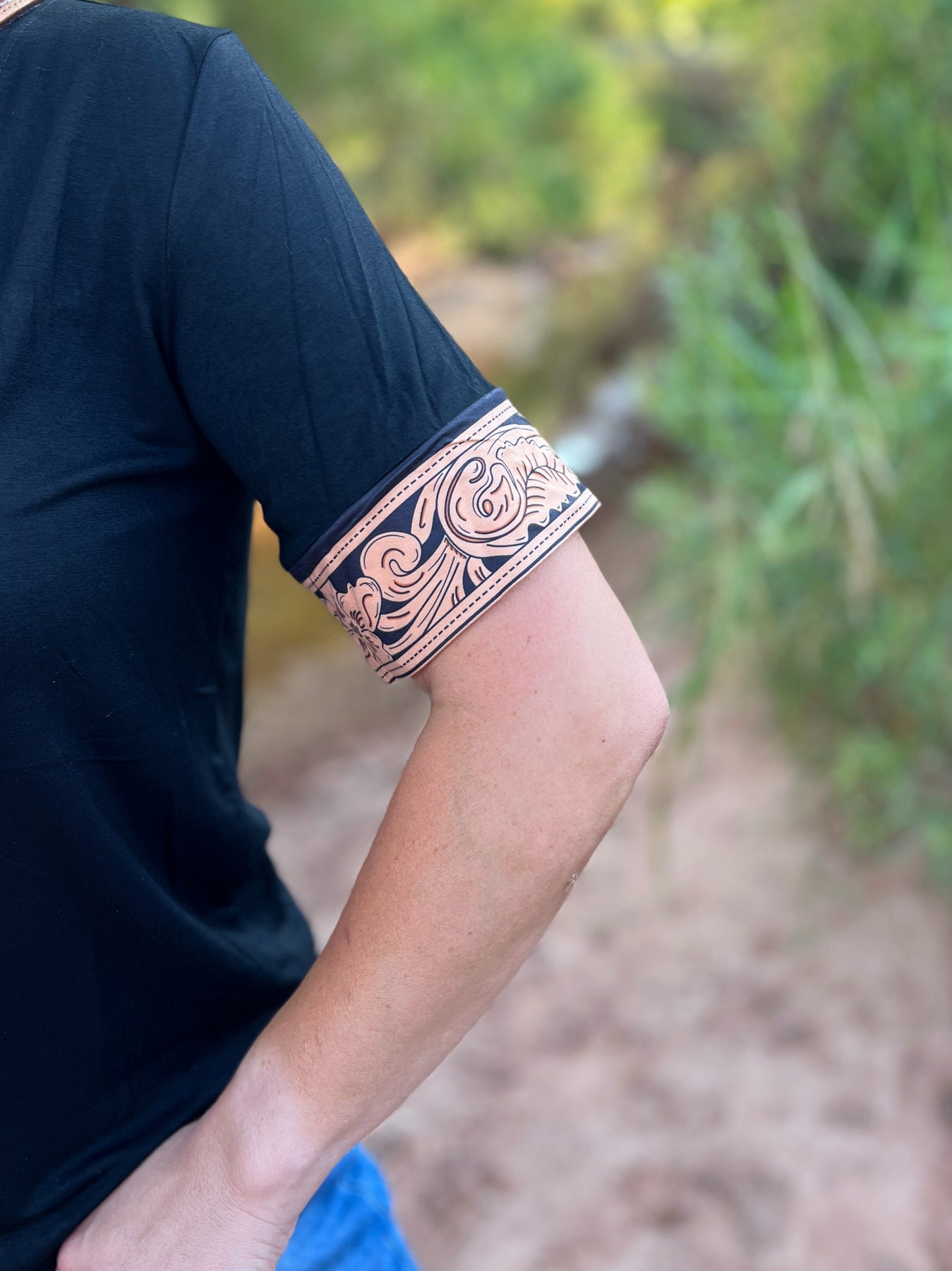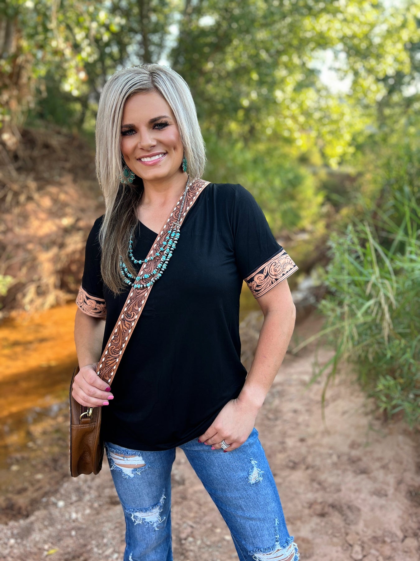 Saddle up in style with The Latigo Top! This v neck black top has a touch of western flair with tooled leather pattern trim (printed material)  on the sleeves. Perfect for adding a unique edge to any outfit. (Giddy up! 🤠)