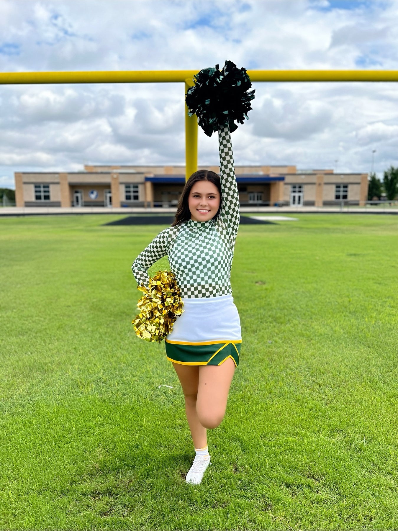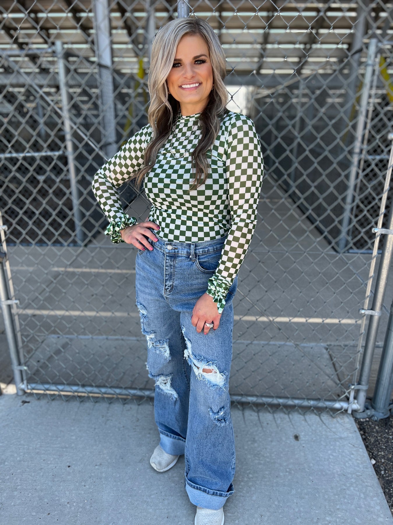 Get ready to stand out at your next pep rally with this quirky and playful green and white checked mesh top! Featuring a unique design, this top will bring some fun and excitement to your game day outfit. Show off your team spirit in style with the Pep Rally Mesh Top. Find all the matching accessories here as well! There is a wild rag, a latigo, and a scrunchie too!
