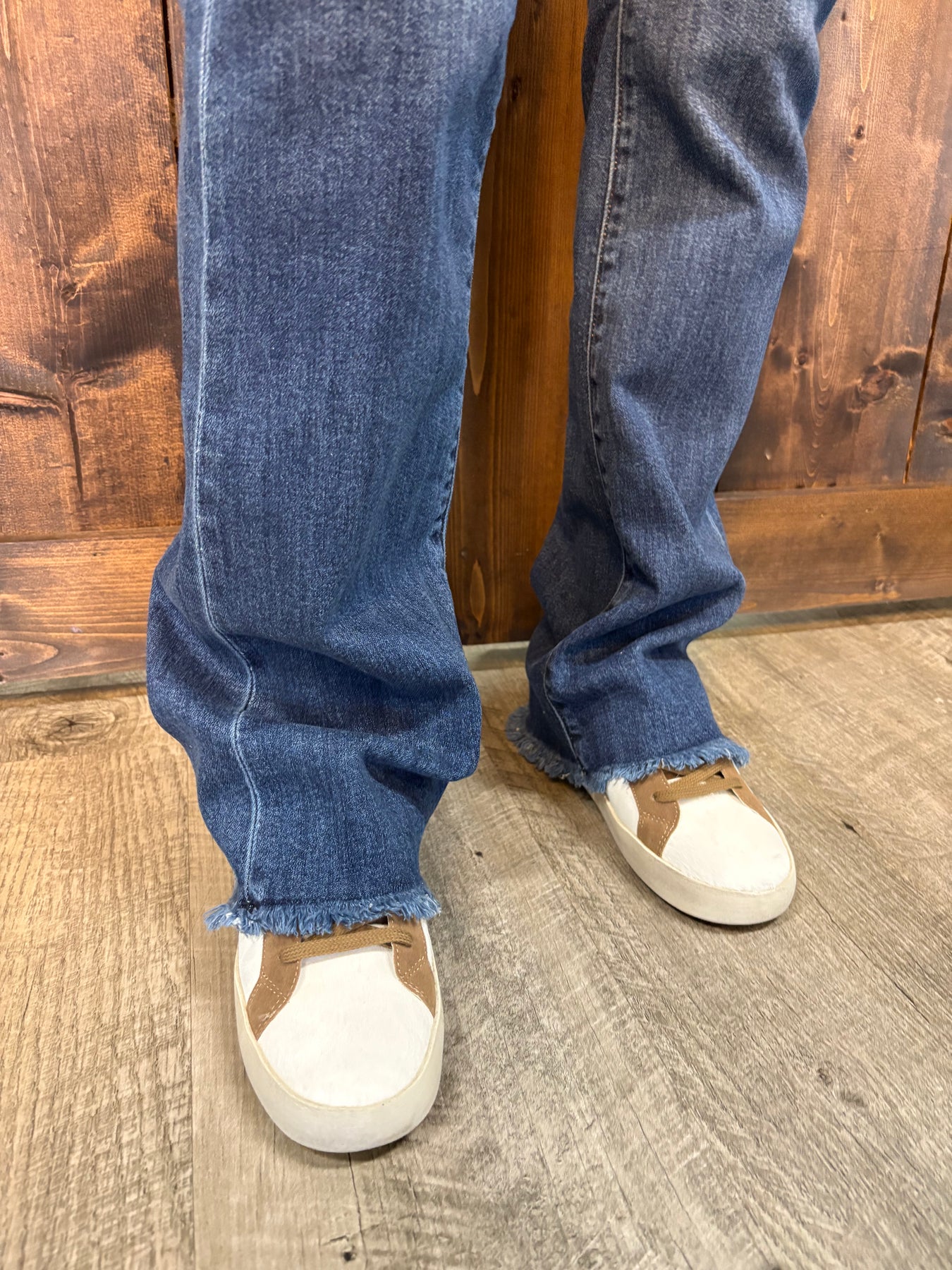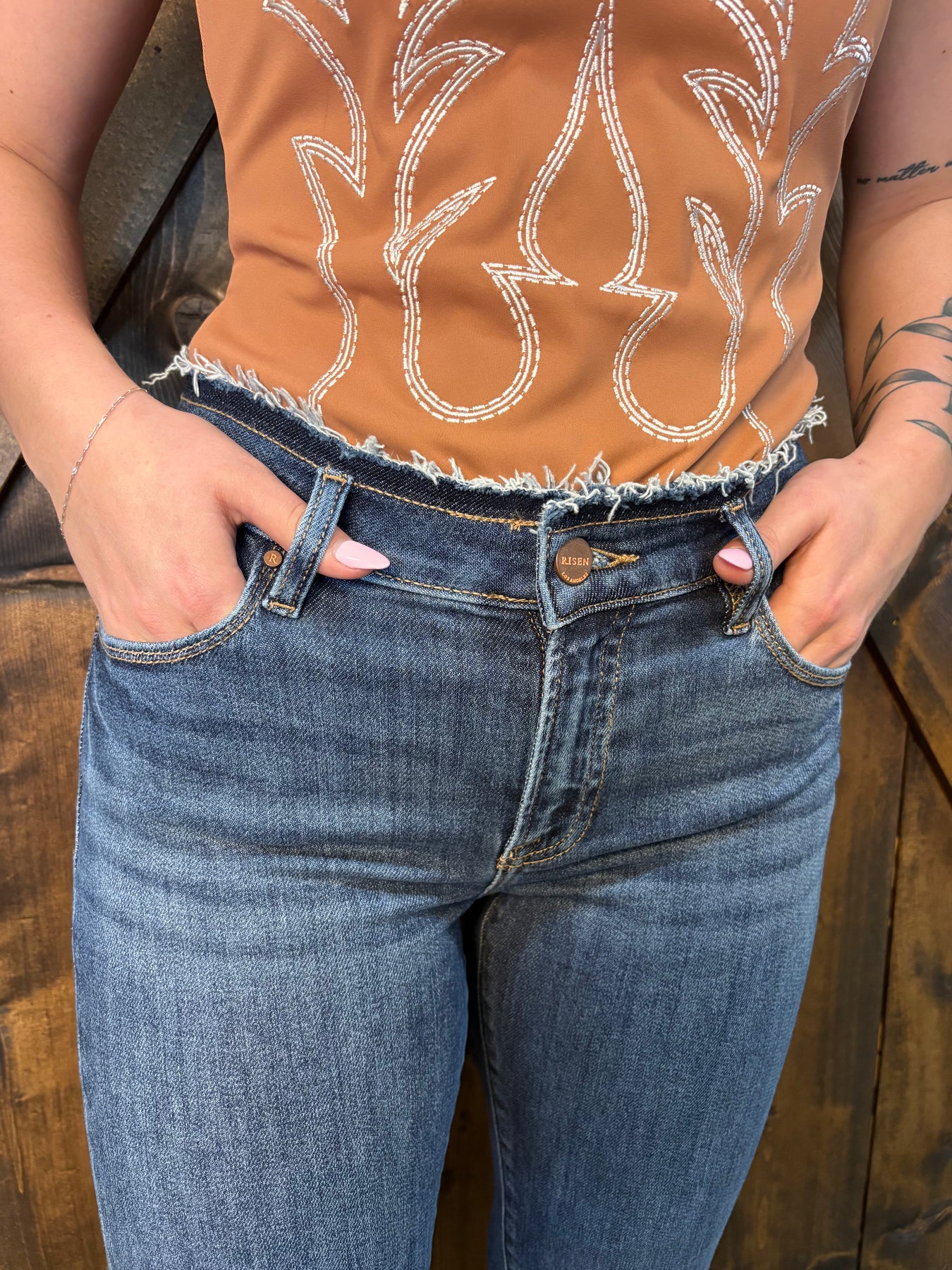 Risen Mid Rise Dark Wash Bootcut Frayed Detail Jeans I Gussied Up Online Boutique