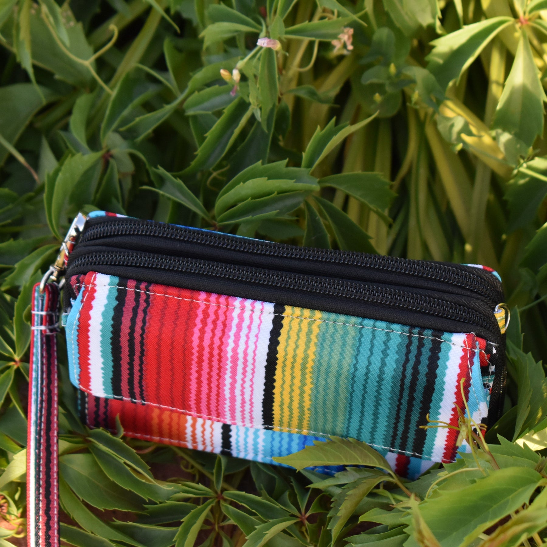 Serape Aztec crossbody wallet with a front snap pouch, two zipper pockets, 9 identification-credit card inserts, 2 cash inserts, and a coin pocket. This wallet comes with a detachable strap that can be removed to create a wristlet wallet as well!
