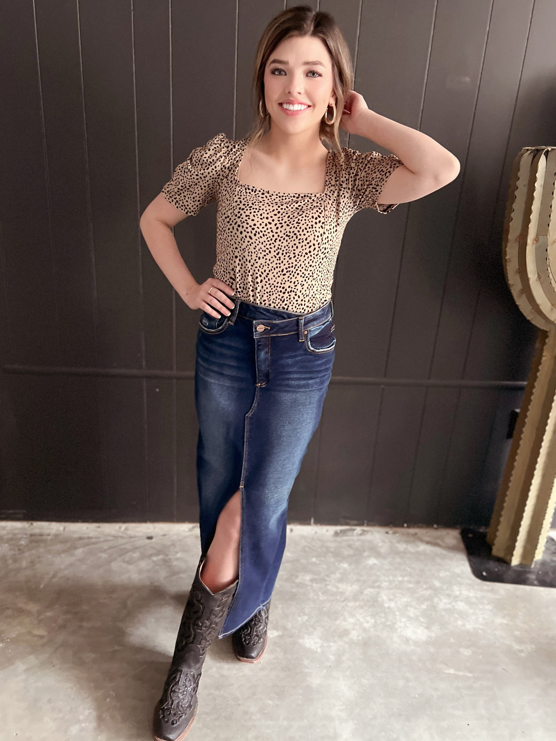 Risen Long Dark Wash Slit Skirt With Crisscross Button