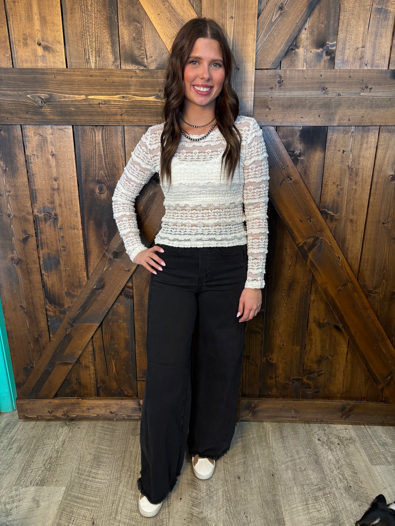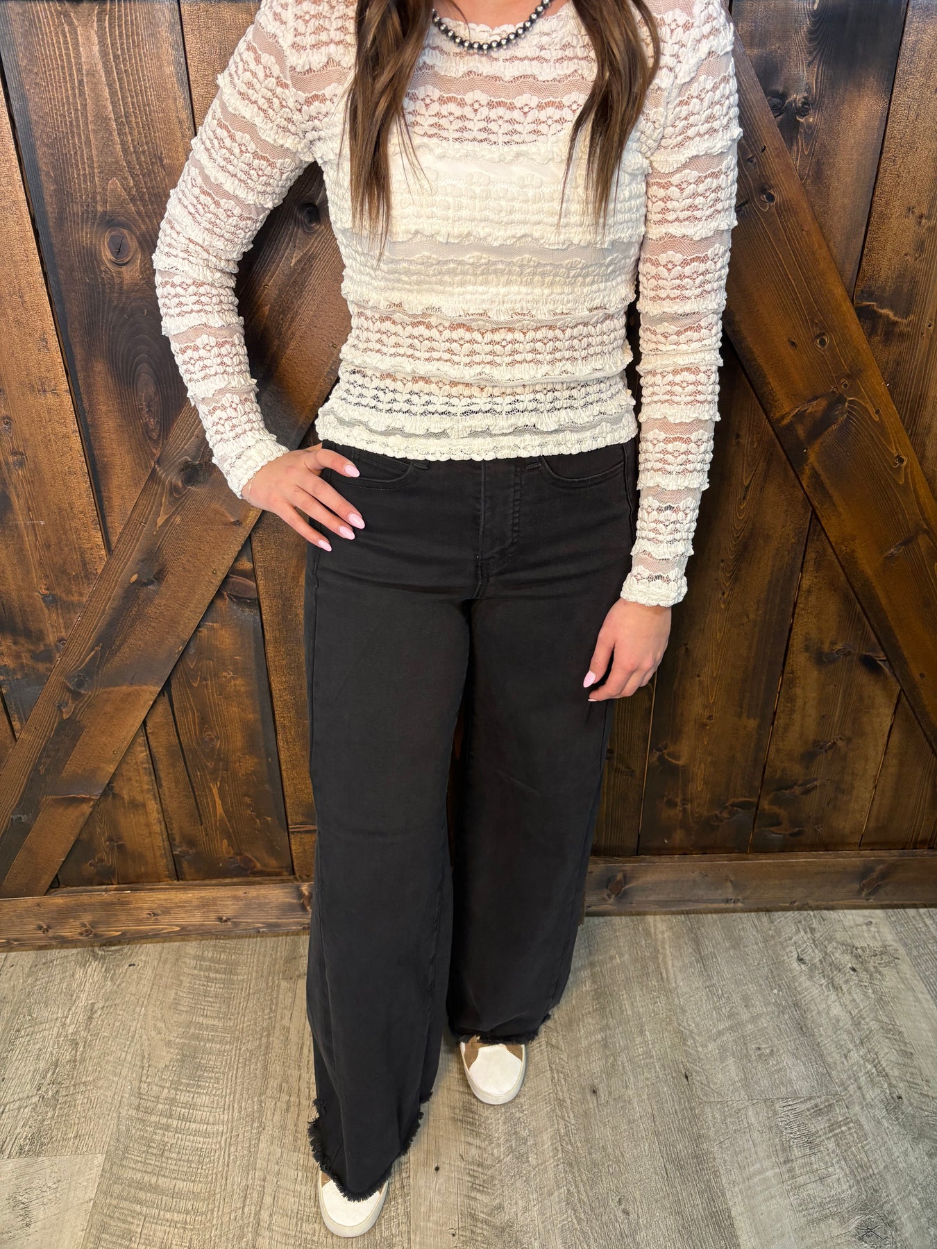 Meet your new favorite pair! These Risen palazzo jeans feature a high-rise cut with built-in tummy control that keeps you looking sleek and feeling supported. The stretchy black denim hugs you in all the right ways while the wide, flowing legs give off major style points. Finished with a fun frayed hem, these comfy jeans are perfect for everything from brunch to date night. Comfort never looked so good!