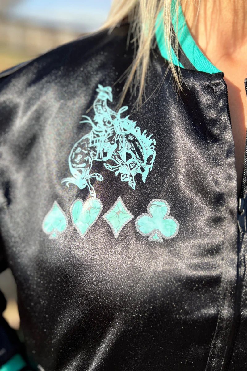 Stay stylish and warm with our Double Down Bomber Jacket. The cute silky material and turquoise accents elevate your look, while the bronco design adds a touch of uniqueness. Perfect for any fashion-forward individual who also wants to stay cozy.