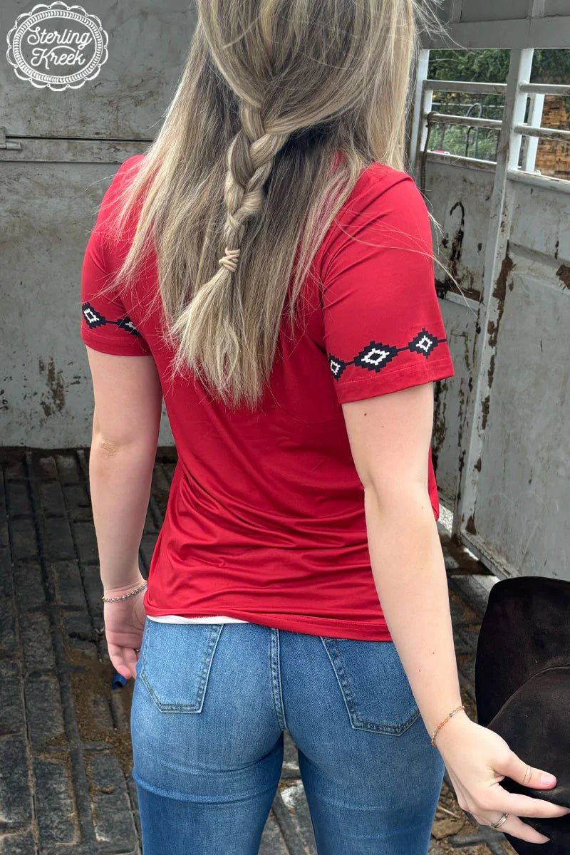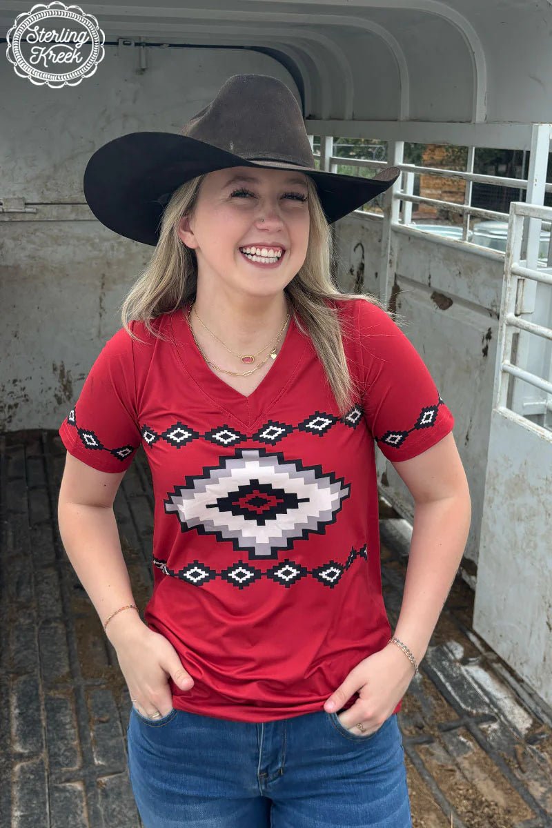 Get ready to roll with the Rolling Like Reba Top! This red vneck top features a unique white and black aztec design on the front and sleeves. Bring a touch of whimsy to your wardrobe with this playful and stylish top.