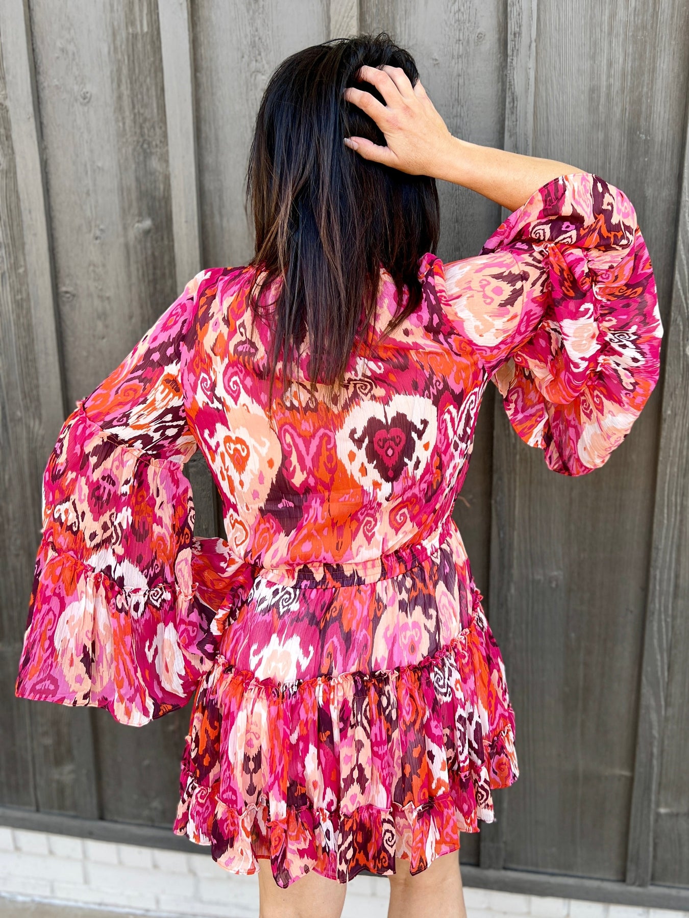 "Be the belle of the ball (or brunch) in our Pink Southern Bell Mini Dress. This playful dress features flirty bell sleeves, a vibrant pink printed design, and ruffled details for a touch of whimsy. Perfect for any occasion, this mini dress will have you feeling fun and feminine!"