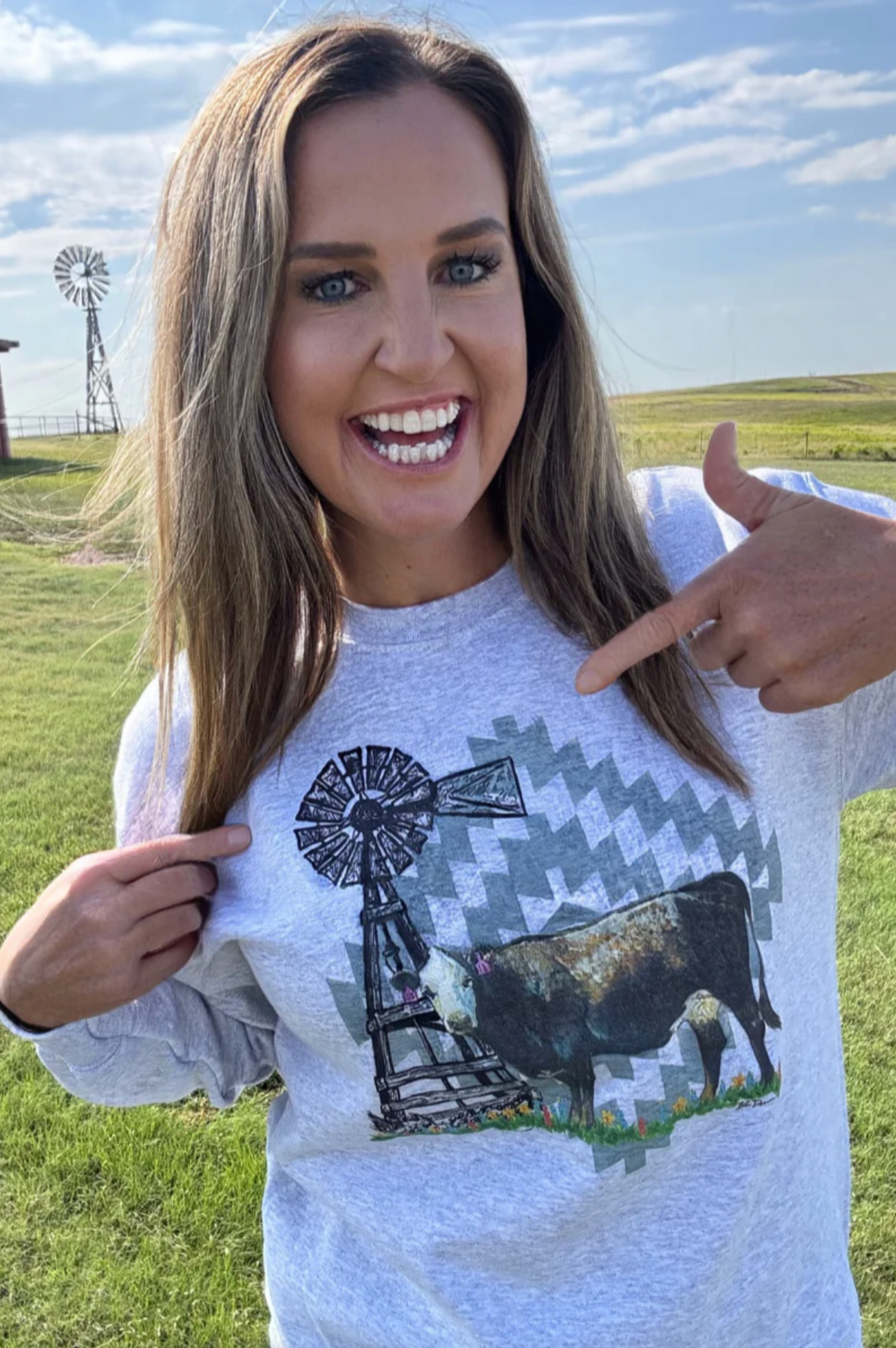 Elevate your casual wardrobe with this unique gray sweatshirt featuring a bold design of a bald-faced cow, intricate Aztec patterns, and a charming windmill. Crafted for comfort and style, it combines classic elements with eye-catching details to keep you cozy while showcasing your distinctive taste. Perfect for everyday wear or making a statement, this sweatshirt promises warmth and personality in one versatile piece.