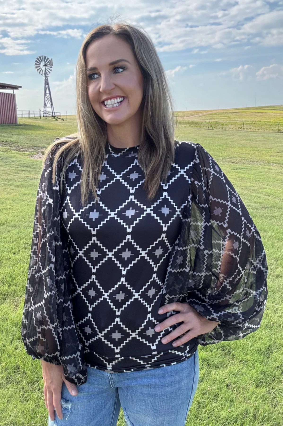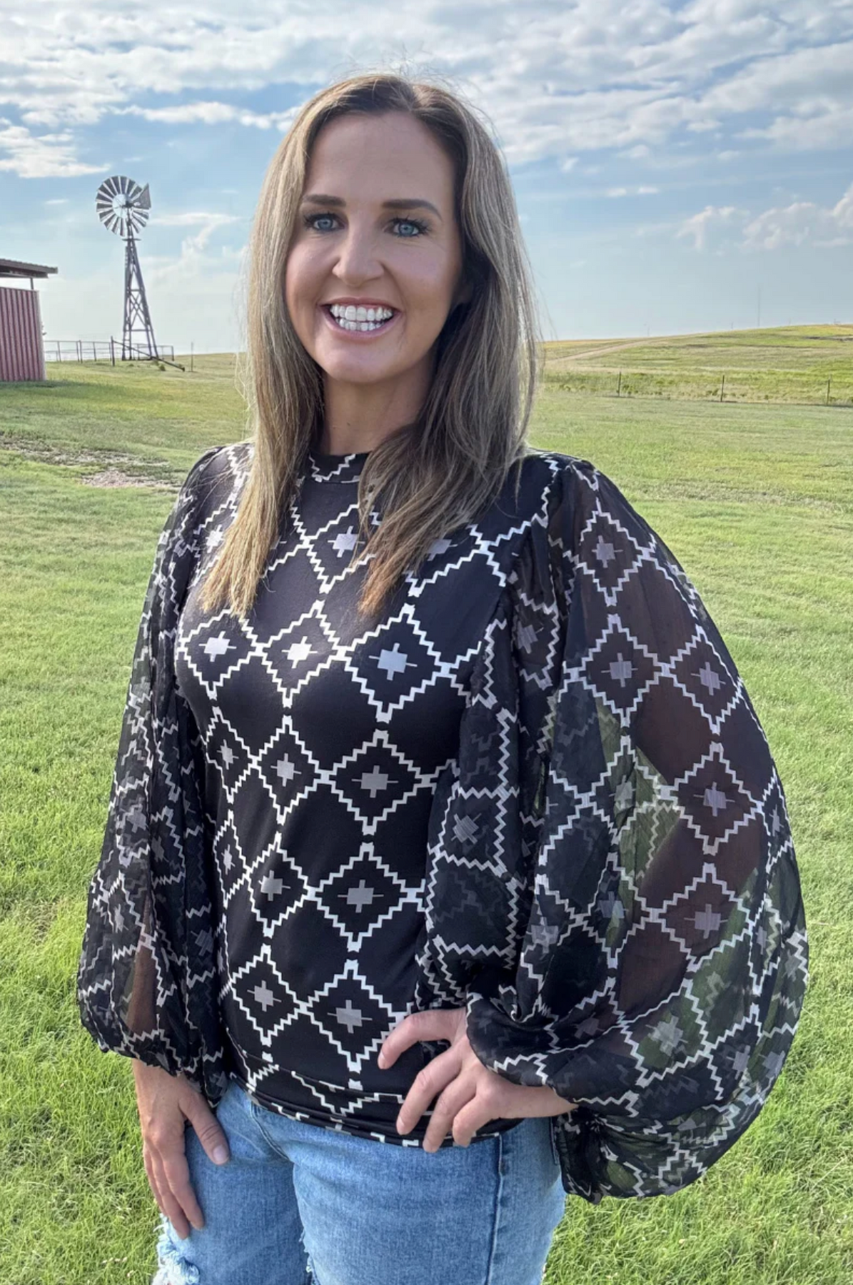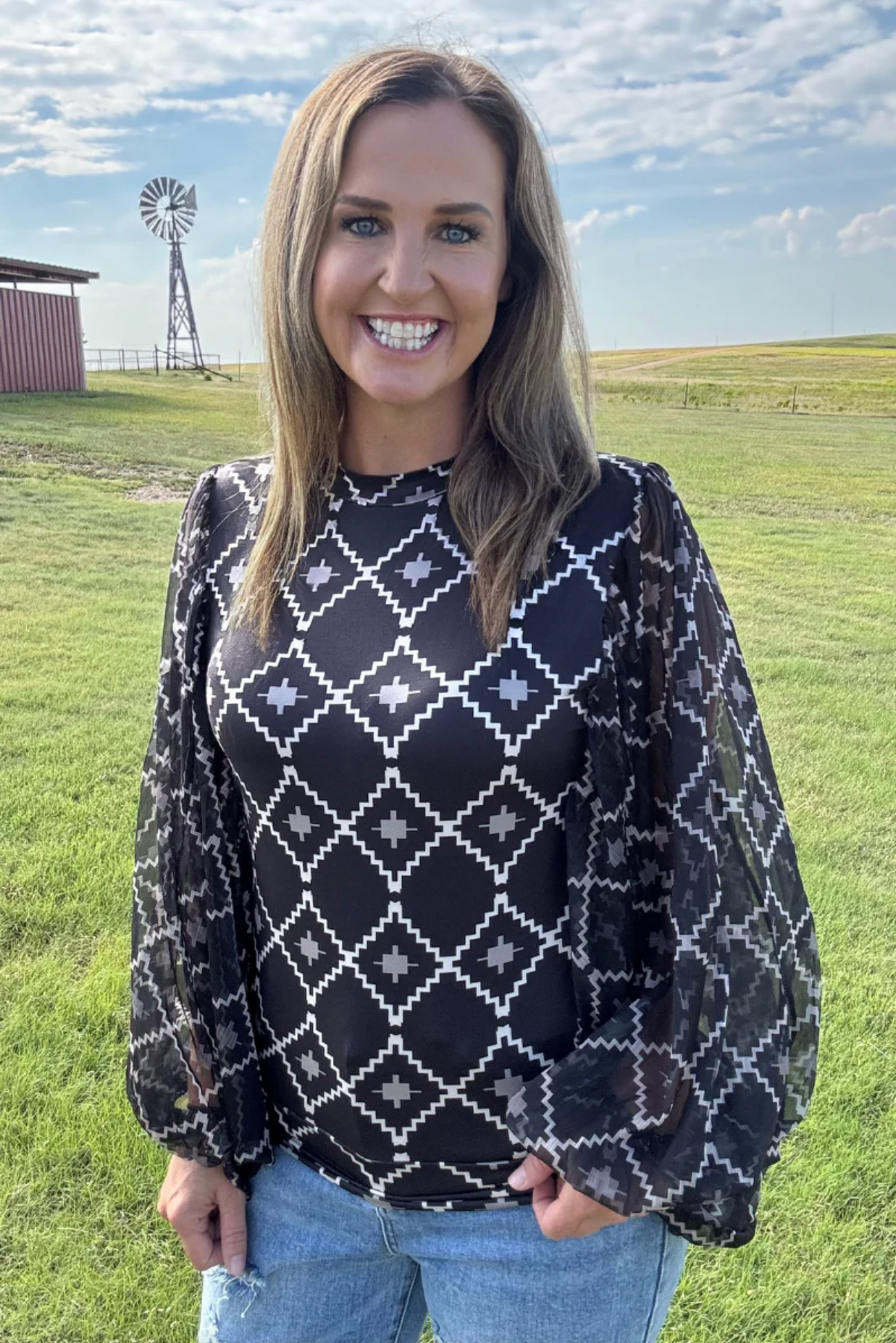 Elevate your style with The Way It Is Top, featuring a dynamic black and white Aztec pattern that adds bold, graphic appeal. The bubble sleeve design offers a trendy silhouette that balances volume with sophistication, perfect for making a statement anywhere. Lightweight and comfortable, this top effortlessly combines eye-catching style with easy wearability to enhance your everyday wardrobe.