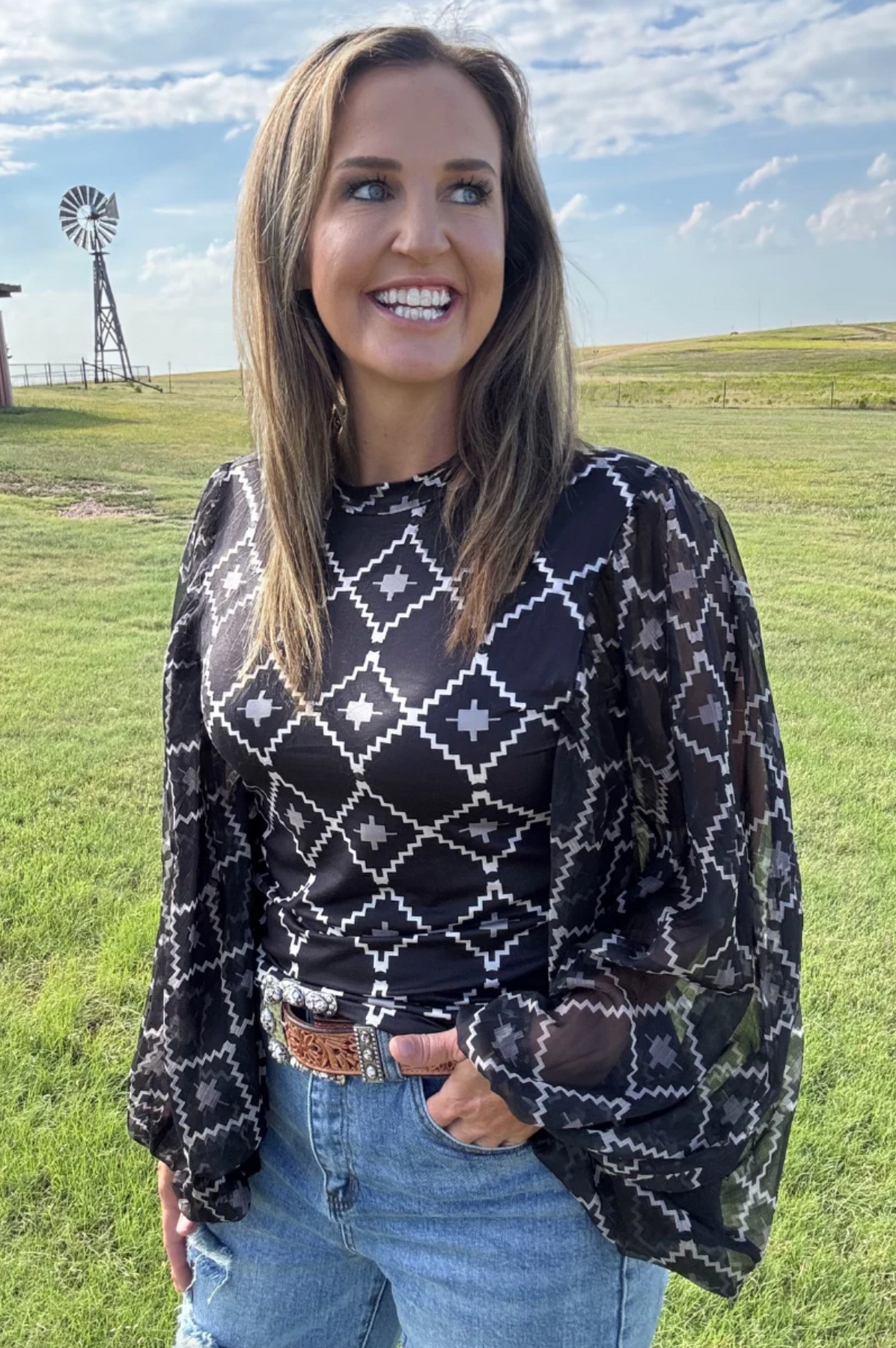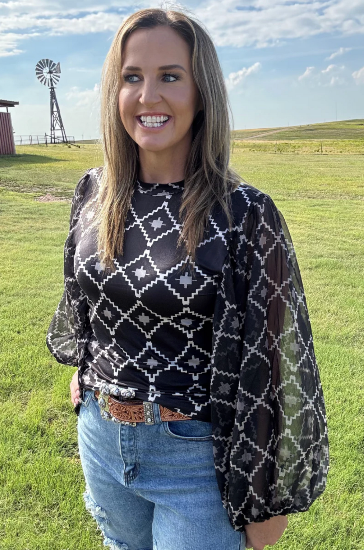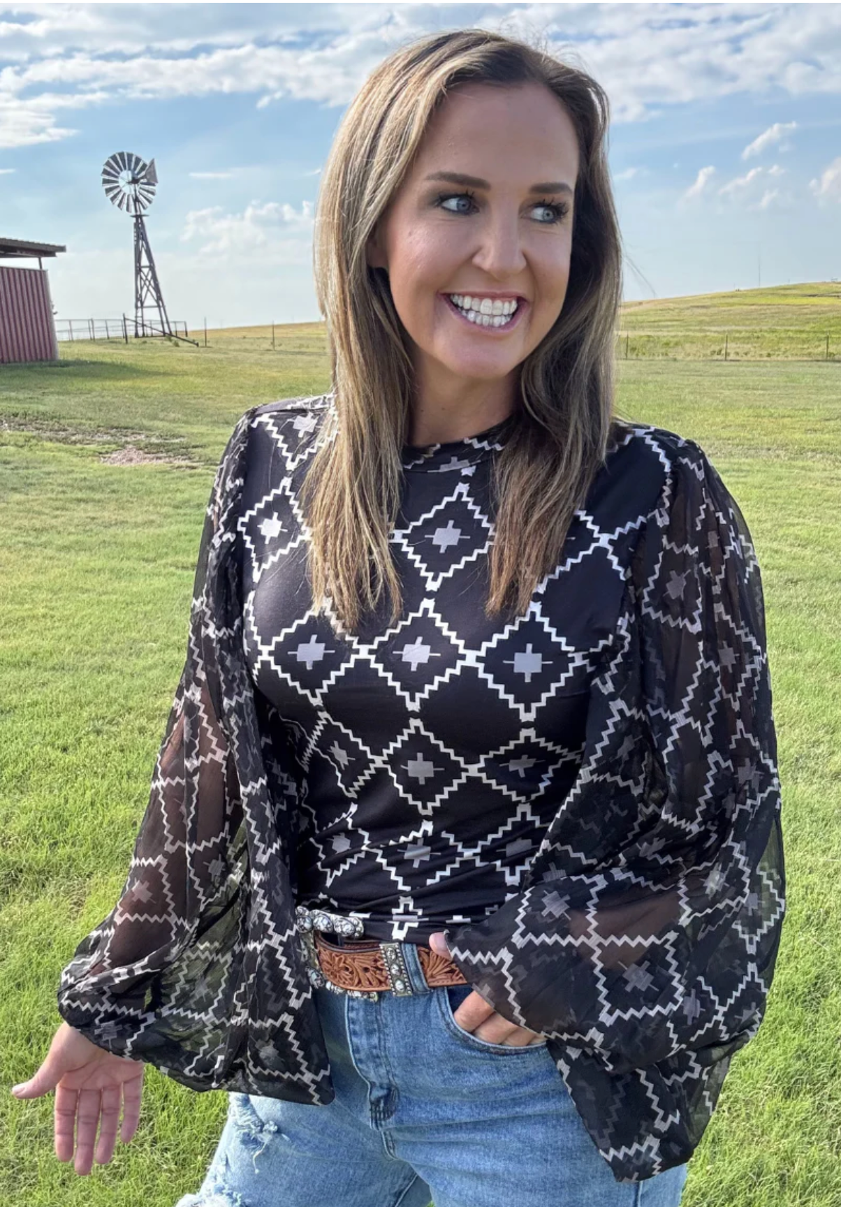 Elevate your style with The Way It Is Top, featuring a dynamic black and white Aztec pattern that adds bold, graphic appeal. The bubble sleeve design offers a trendy silhouette that balances volume with sophistication, perfect for making a statement anywhere. Lightweight and comfortable, this top effortlessly combines eye-catching style with easy wearability to enhance your everyday wardrobe.