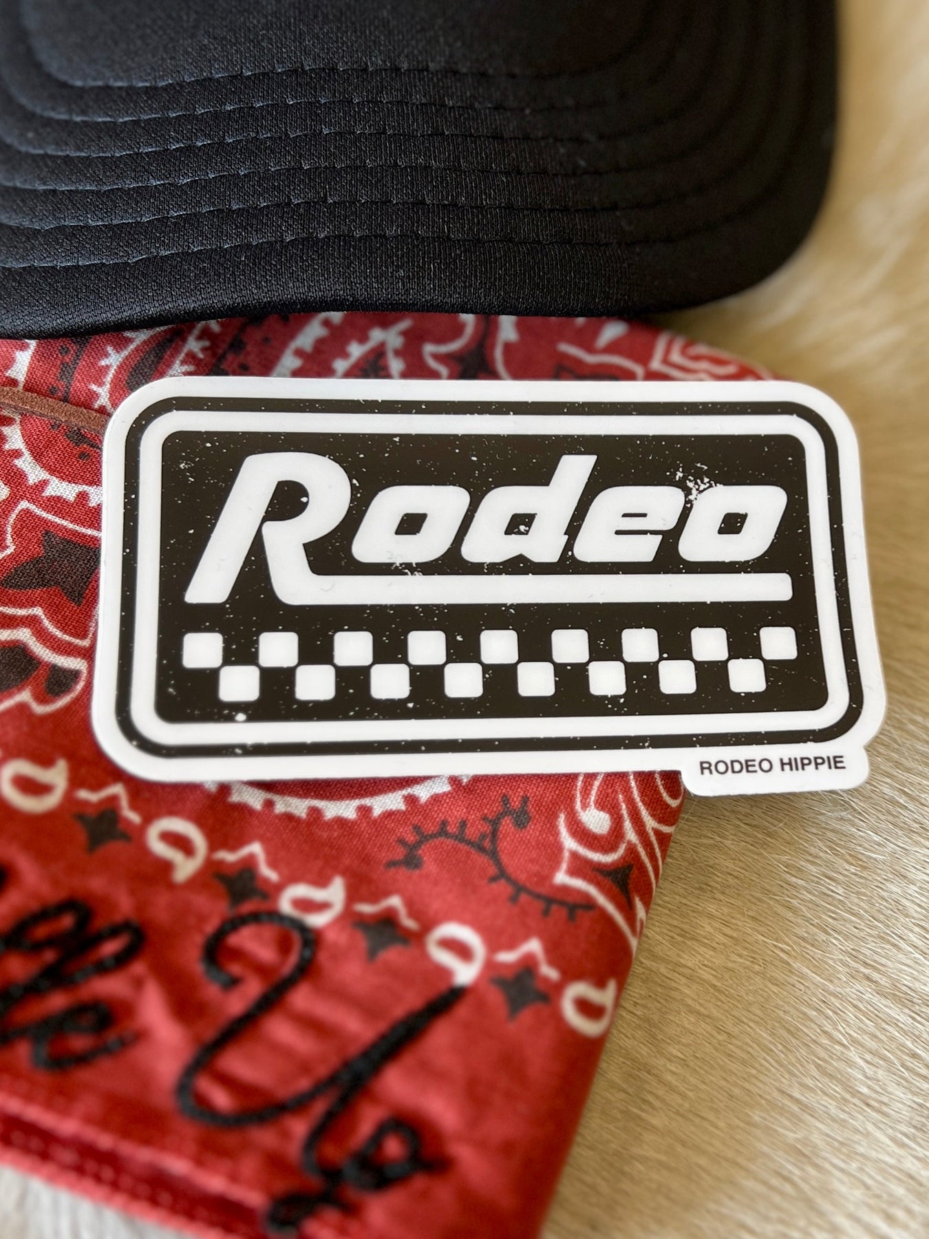 Add some rodeo flair to your belongings with our Rodeo Racer sticker! This 4"X2" black and white sticker features a checkered design and the word "rodeo". Perfect for any rodeo fan or to add some playful humor to your belongings. Giddy up and grab one today!
