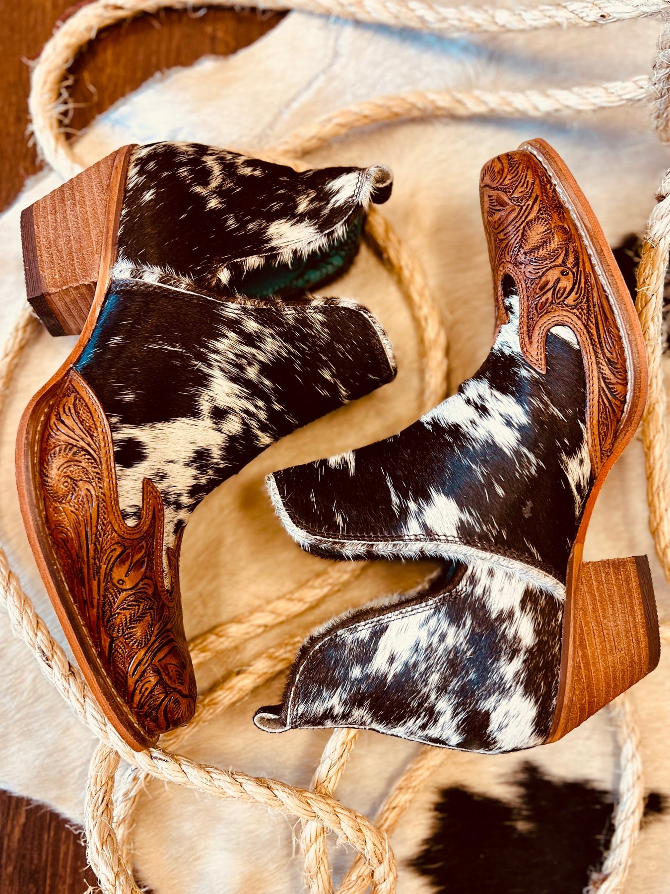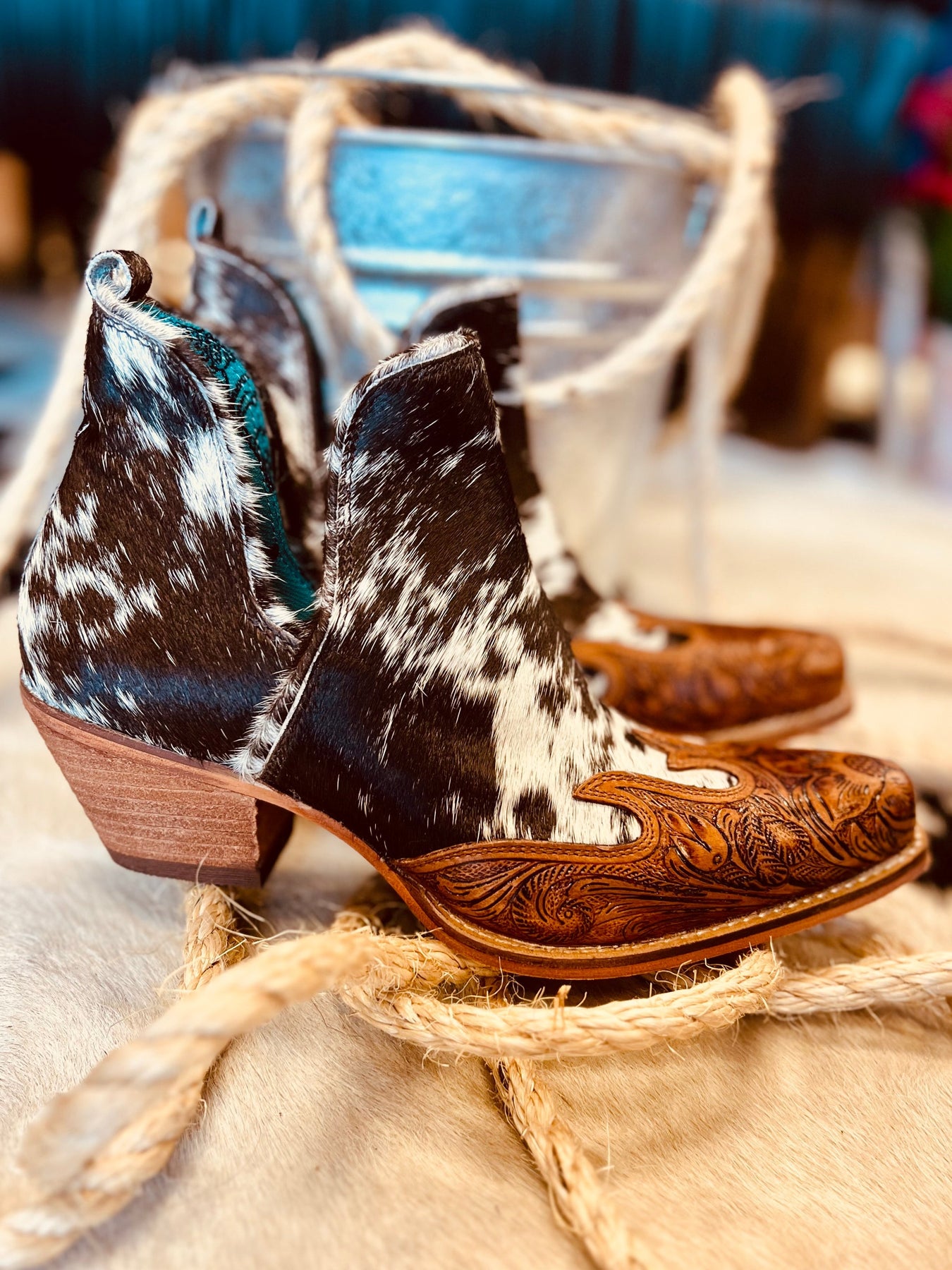 Frisco Blossom Hair On Hide Tooled Booties | Gussied Up Online Boutique