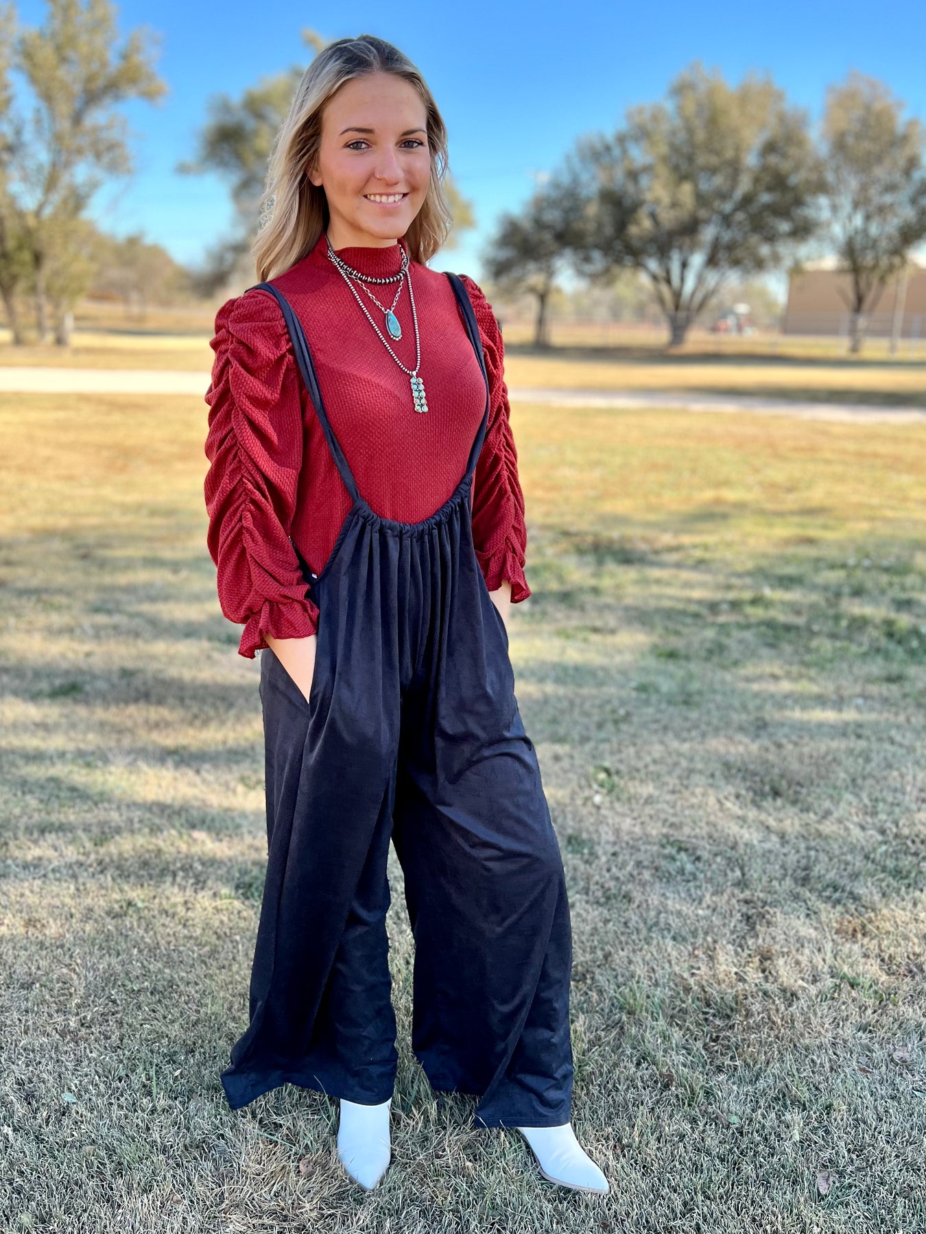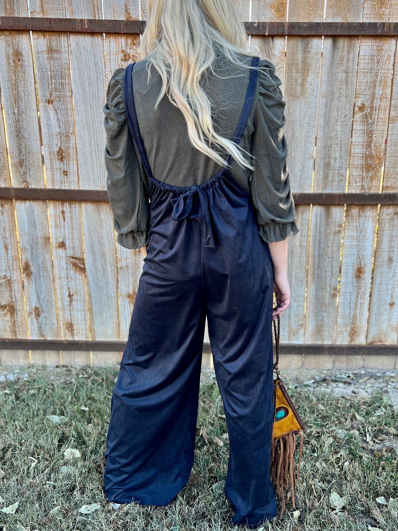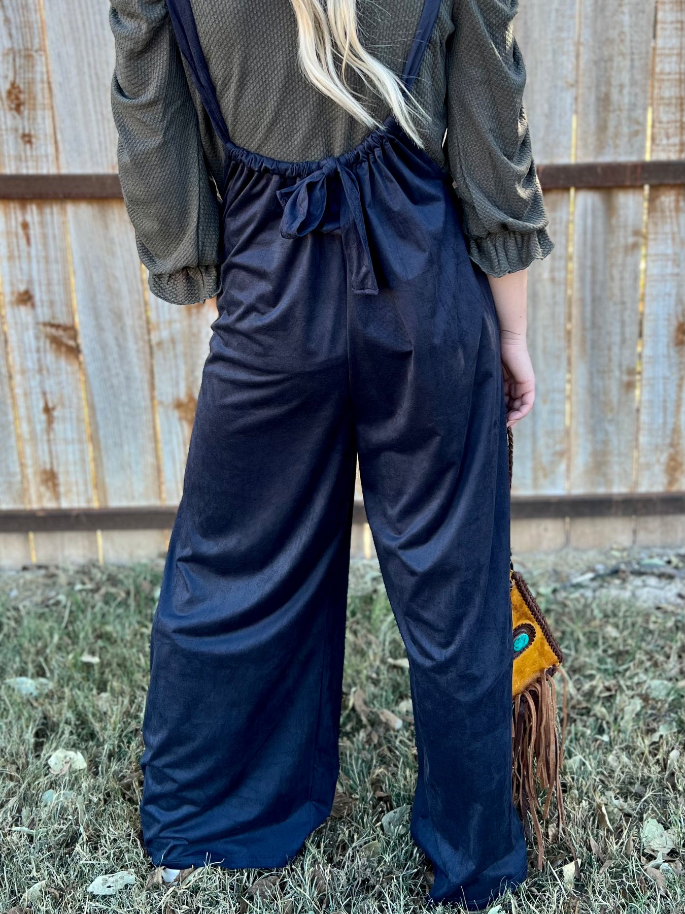 Are you looking for an outfit that's chic, versatile, and comfortable? Look no further than Black Velvet Cover-Somes. These black velvet low cut overalls feature a tie in the back and wide leg pants for maximum styling potential. Feel free to customize your perfect look - the possibilities are endless!