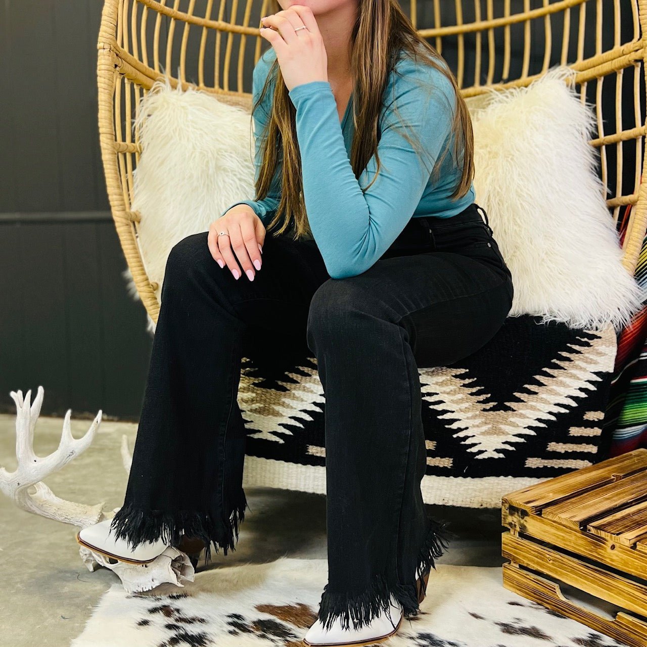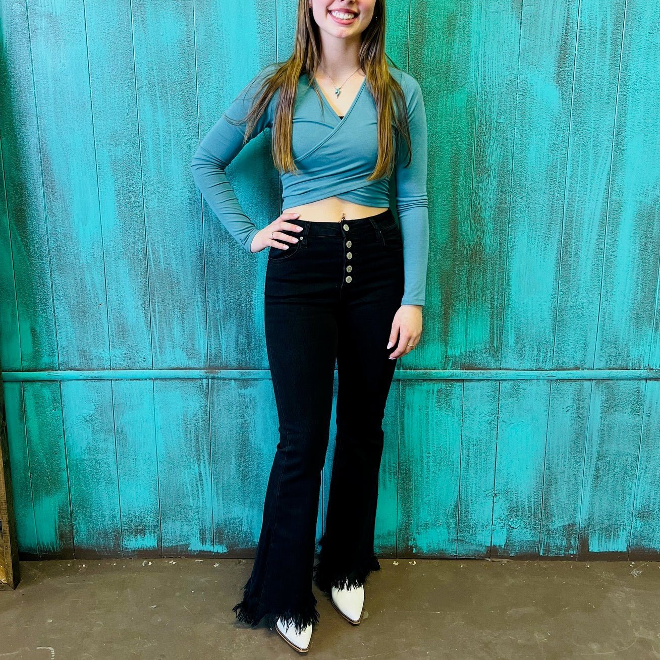 The I'll Have To Charge You Jeans are a black denim, 5 Button Down Wide Flare Jeans. The jeans are true to size and very figure flattering. Model is wearing a size 3; waist: 25", hip: 32 1/2", front rise: 10 1/2", leg opening: 17 3/4", inseam:24".