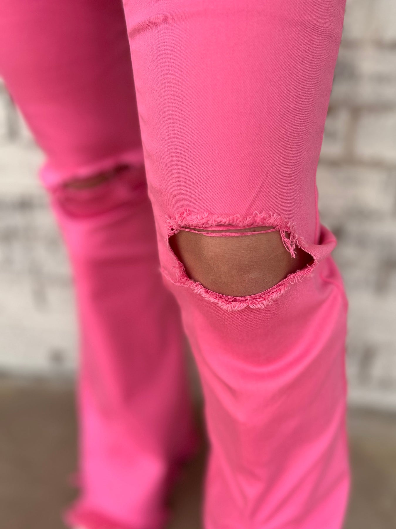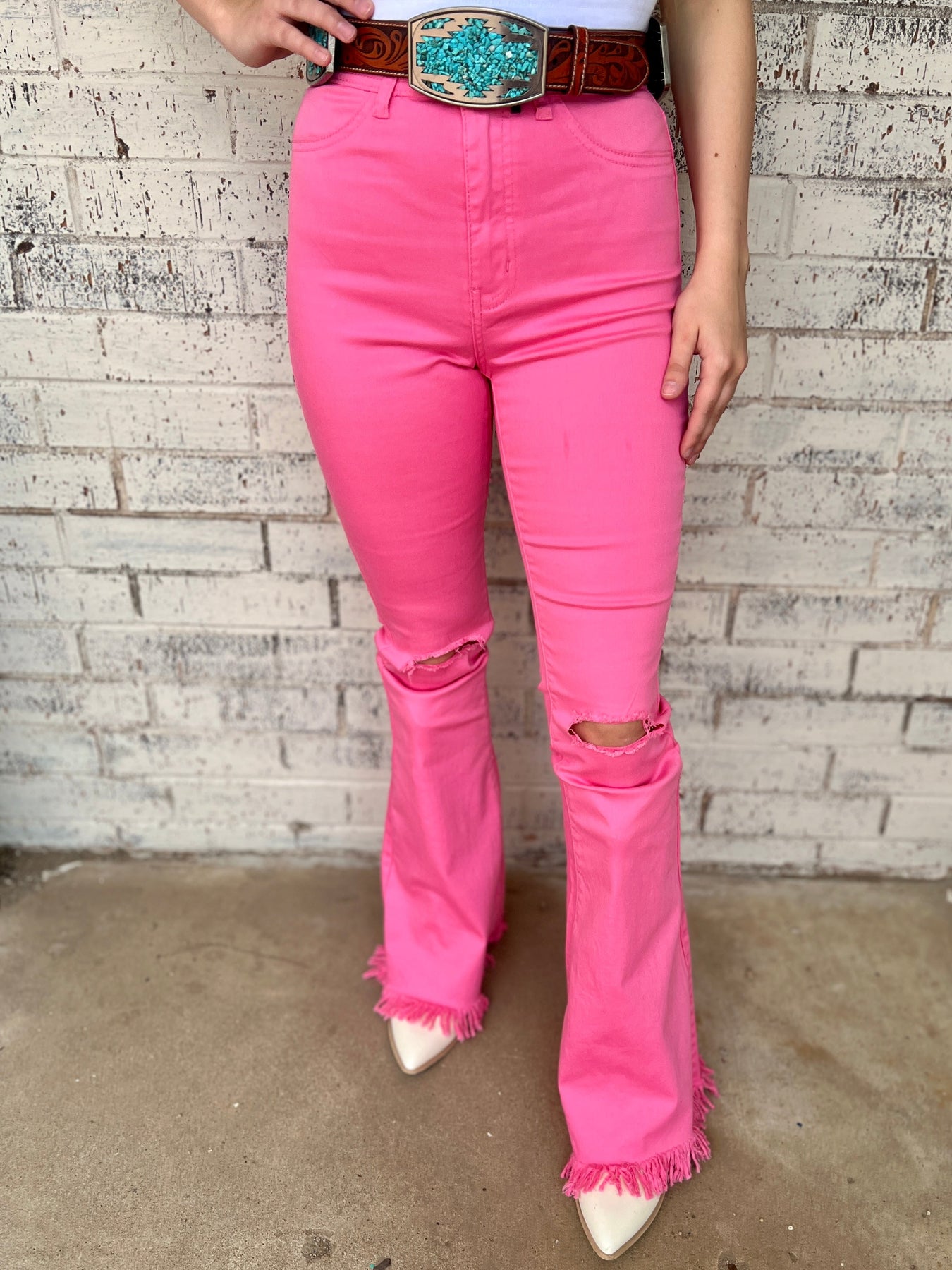 JCJQ Sunset Fringe Flares| Gussied Up Online High waisted pink jeans with holes at the knee and fringe at the hem of the flare.