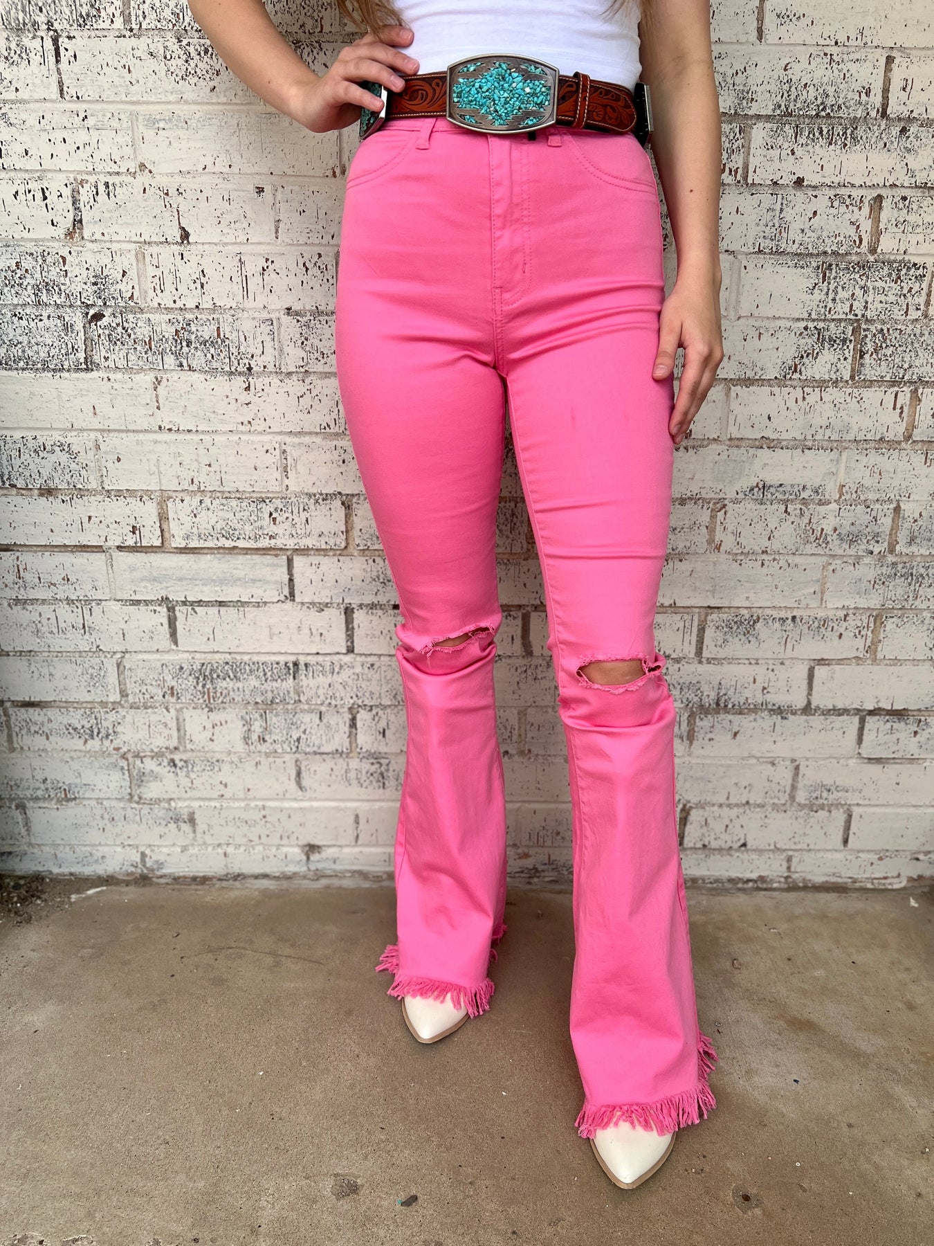 High waisted pink jeans with holes at the knee and fringe at the hem of the flare.