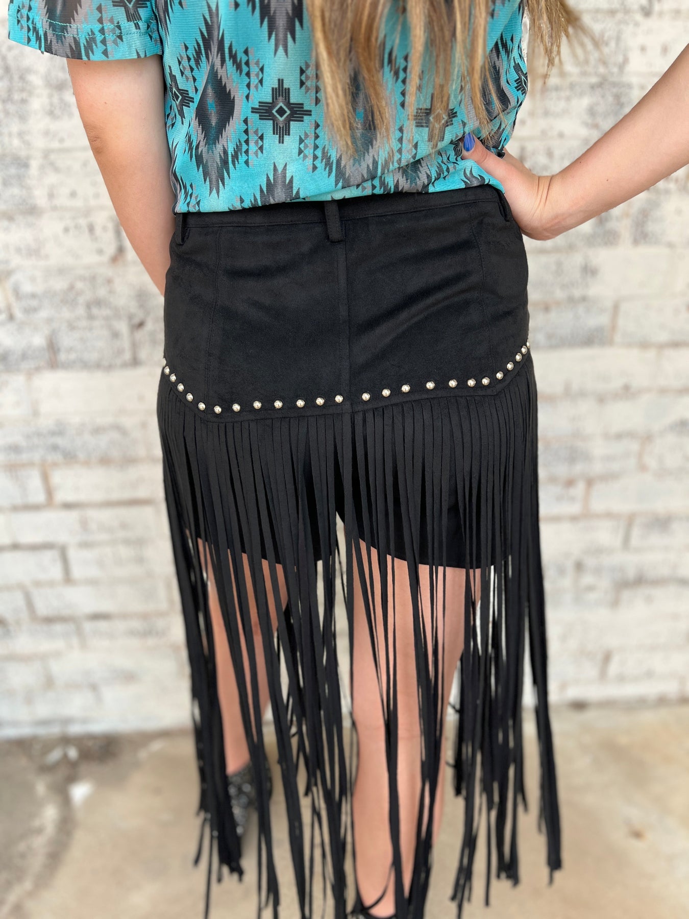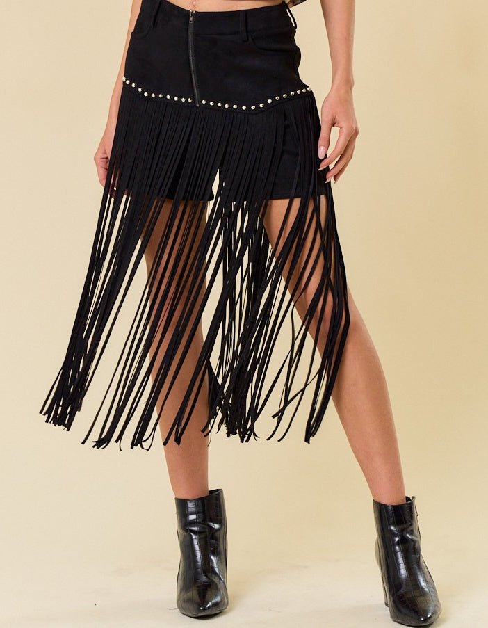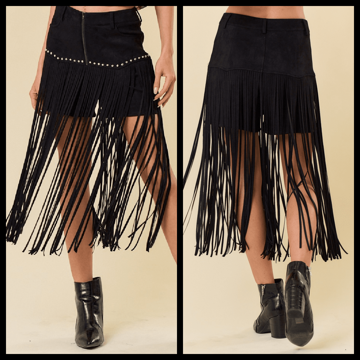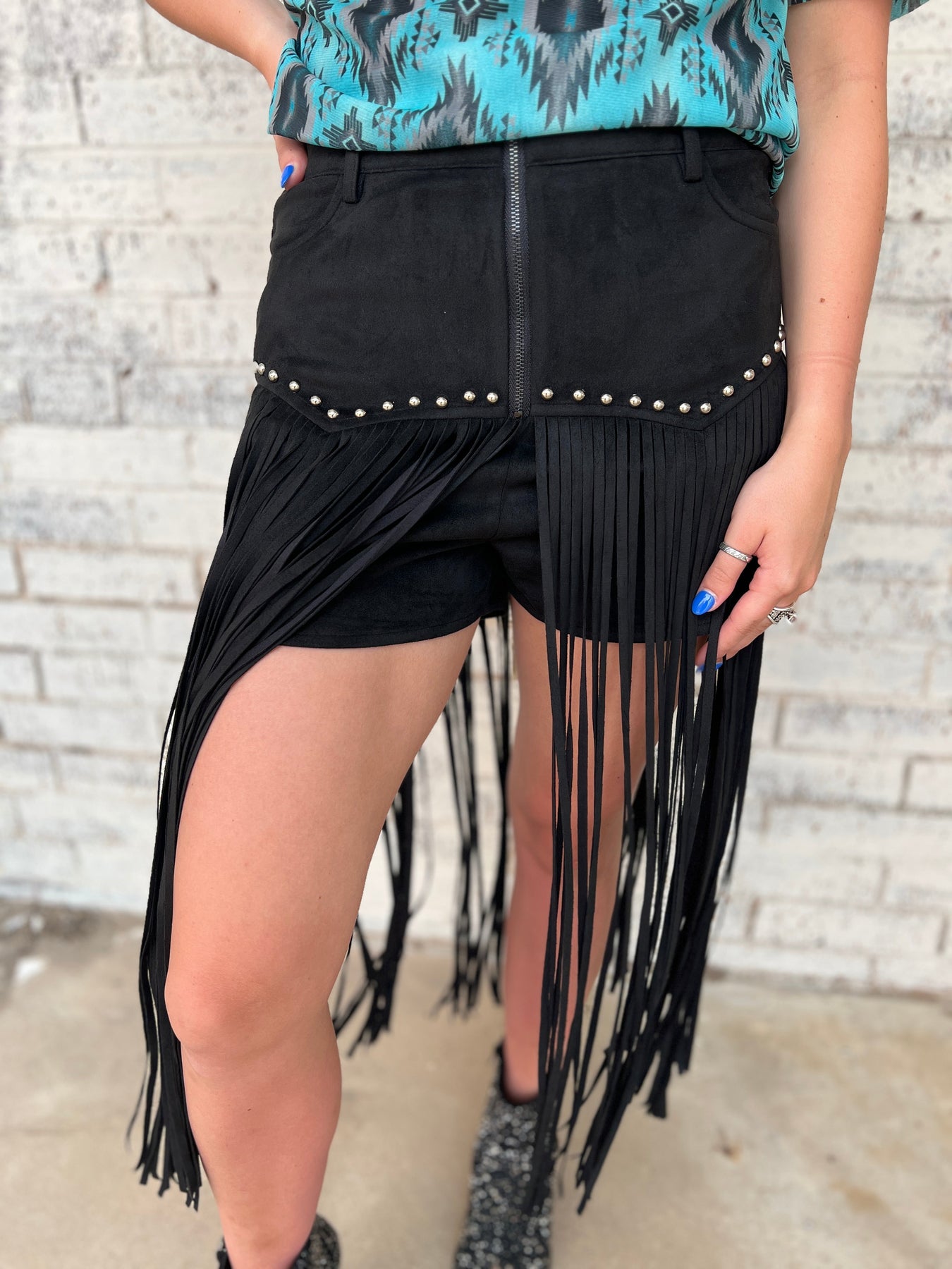 Discover the perfect balance between style and comfort with The Great Divide Shorts. Made of luxurious black suede, these shorts feature edgy silver stud embellishments and long fringe for a fun, flirty look. With a skirt appearance and shorts function, you'll never have to sacrifice fashion for functionality again.