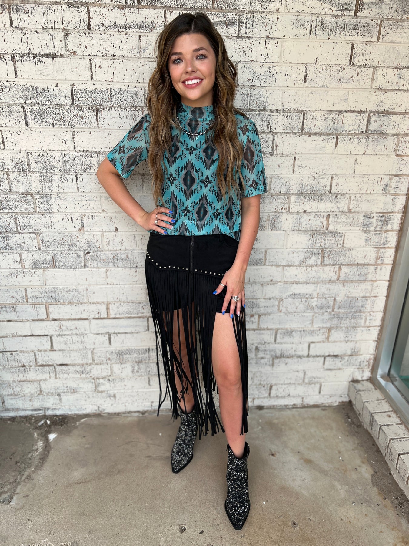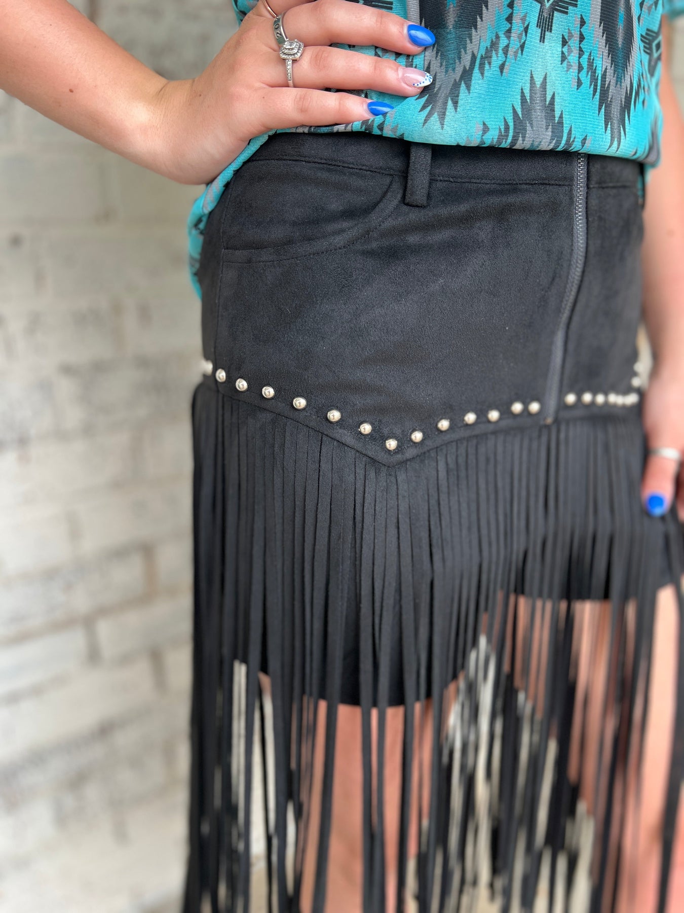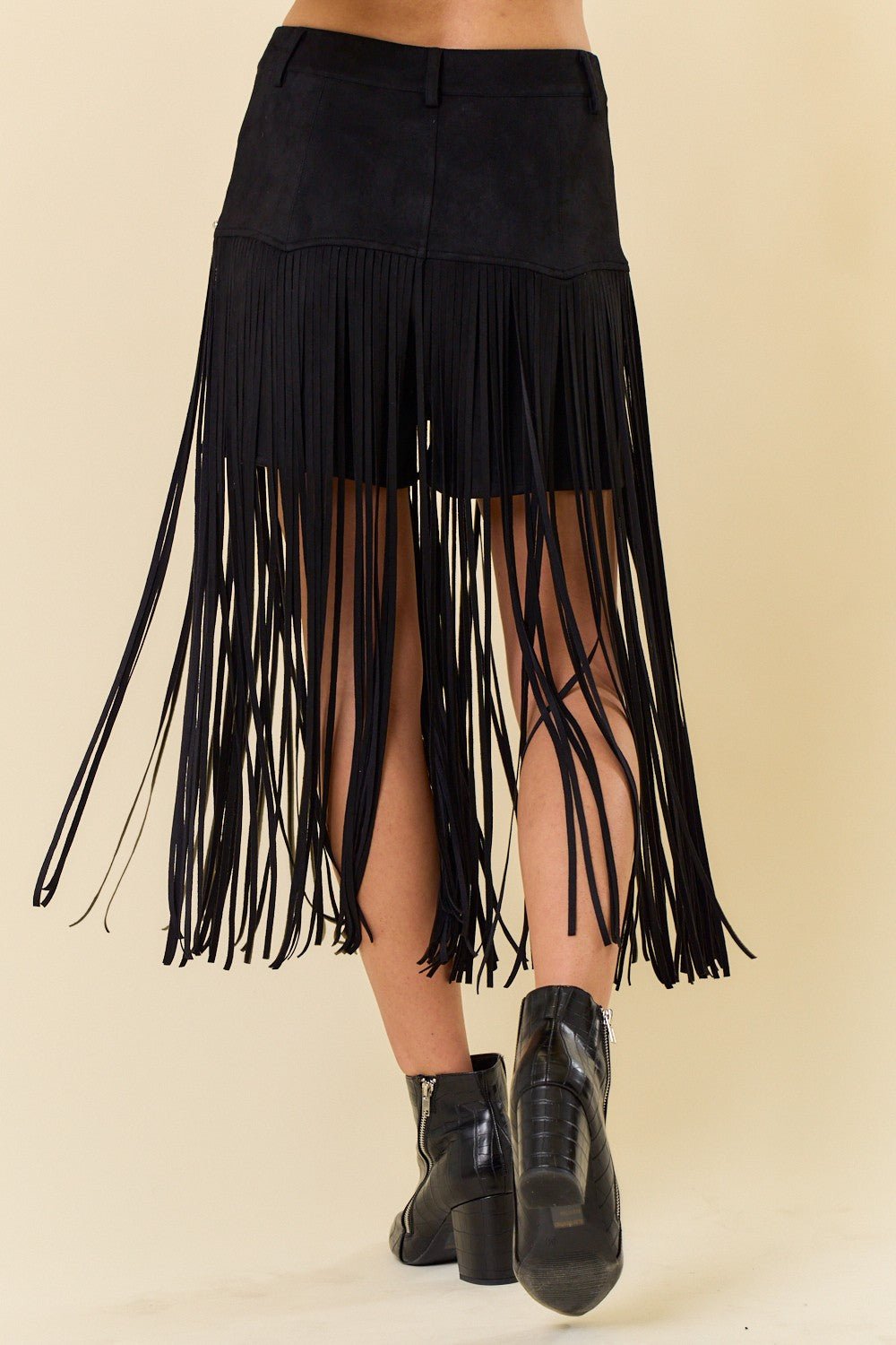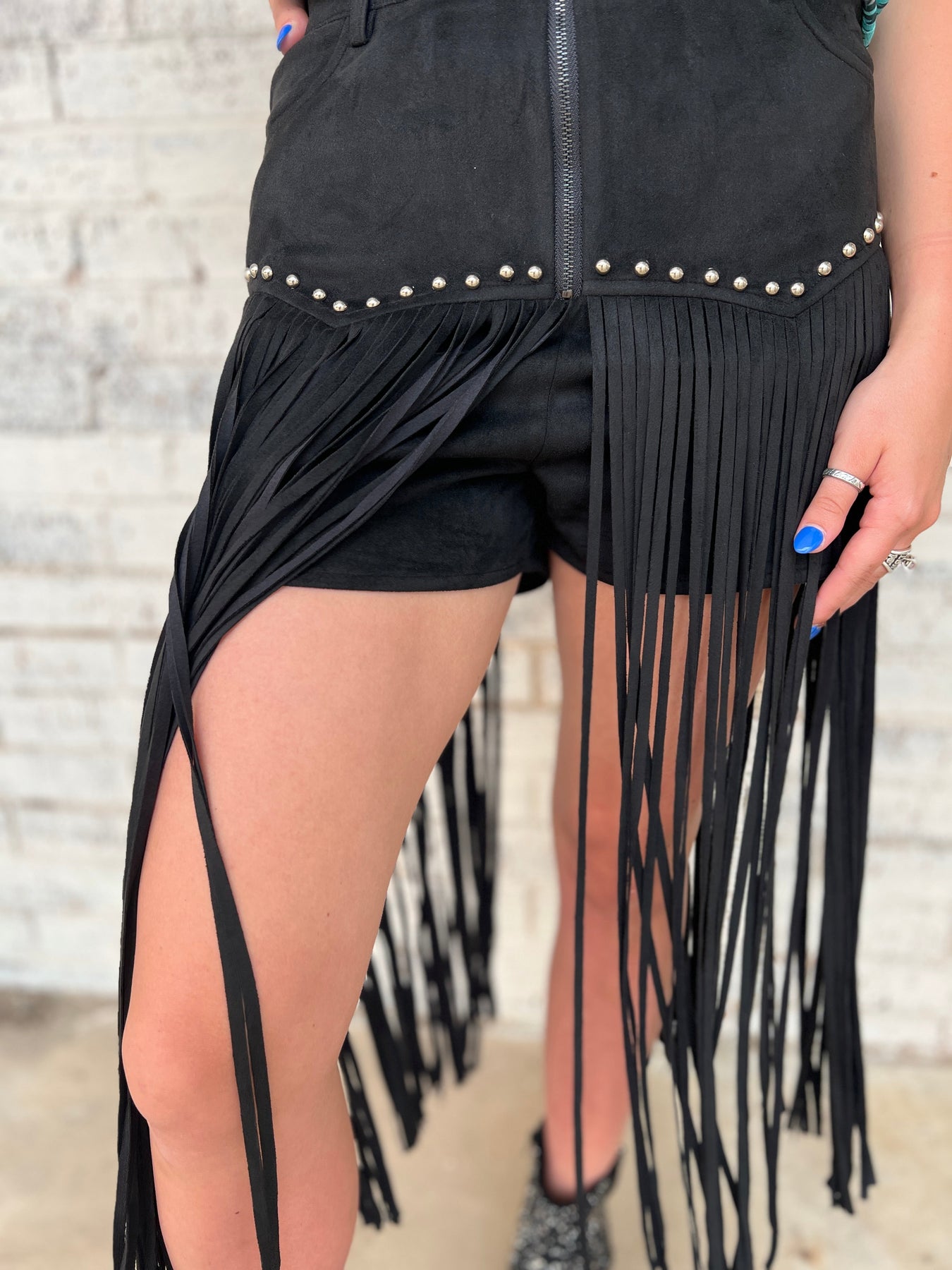 Discover the perfect balance between style and comfort with The Great Divide Shorts. Made of luxurious black suede, these shorts feature edgy silver stud embellishments and long fringe for a fun, flirty look. With a skirt appearance and shorts function, you'll never have to sacrifice fashion for functionality again.