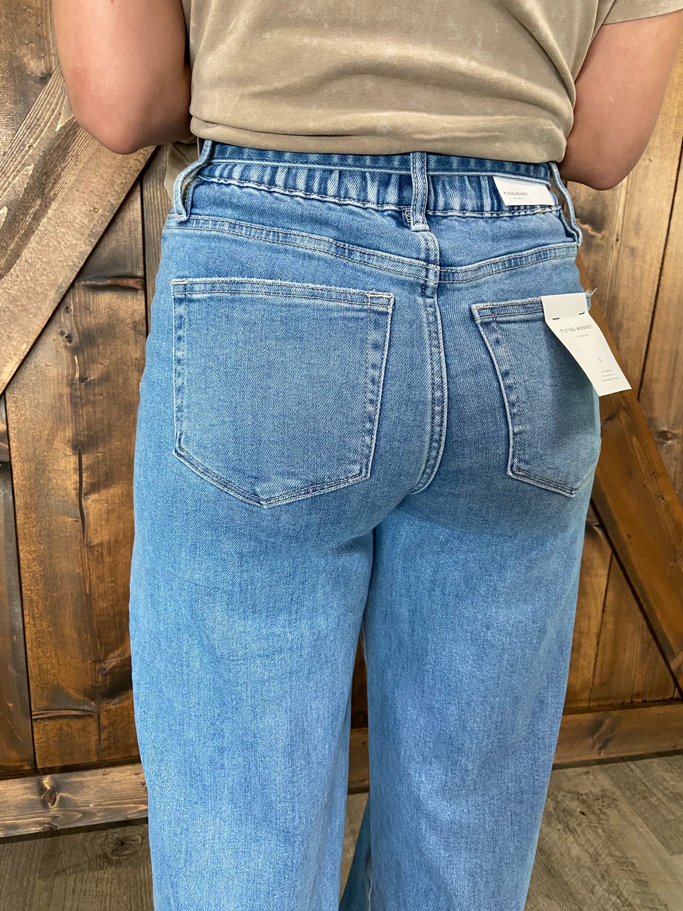 These light wash high-rise jeans combine comfort and style with a playful twist. The elastic waistband and drawstring offer an adjustable fit, while the wide leg silhouette adds a breezy, relaxed vibe. Big front pockets bring functionality and a fun touch to your everyday look. Perfect for effortless cool on any day!