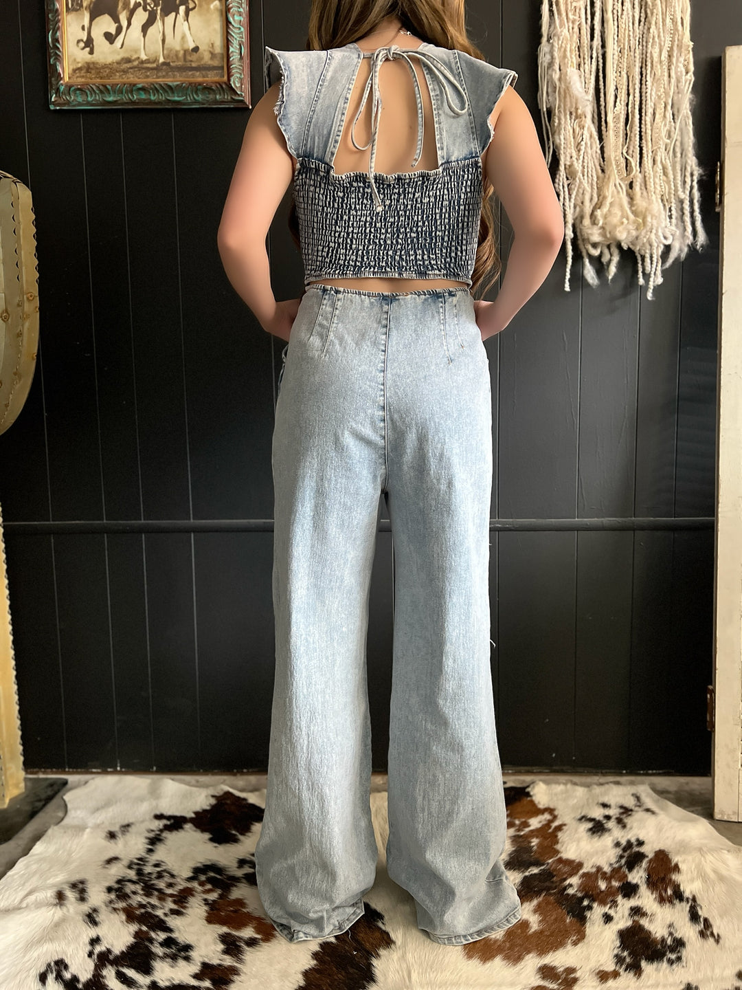 Ruffled Denim Open Smocked Back Jumpsuit*
