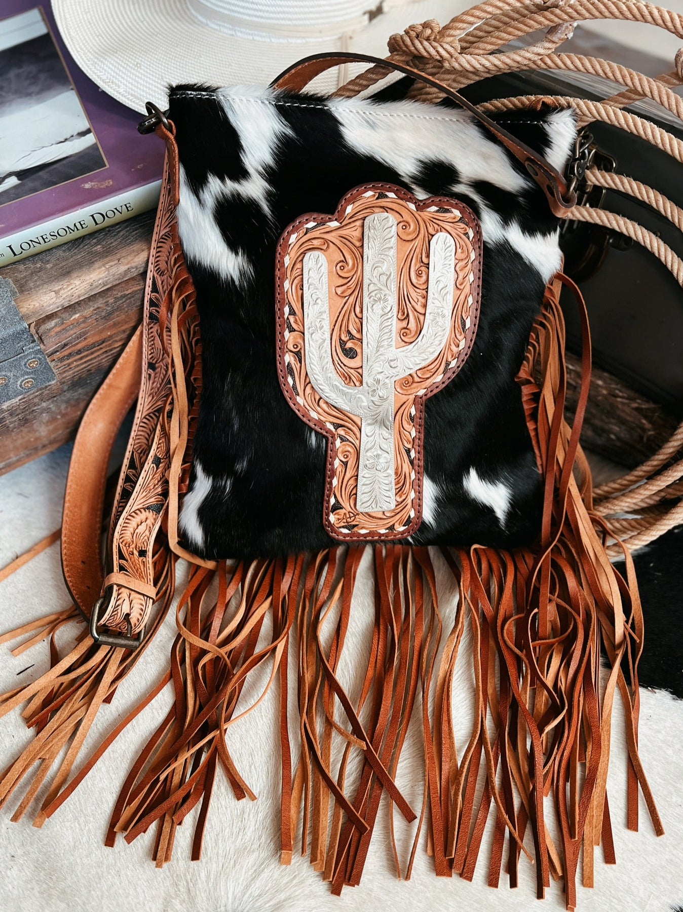 Embody the spirit of the West with our Darling Four Winds Blown Bag. Featuring a stunning silver cactus design on genuine leather, this bag exudes high quality and outstanding craftsmanship. The adjustable and removable tooled leather shoulder strap adds versatility, while the brown leather fringe and hair on hide detail make a trendy statement. The backside is solid and smooth brown leather so no wear and tear on the hide. Two back zipper concealing pockets and zipper closure at the top.