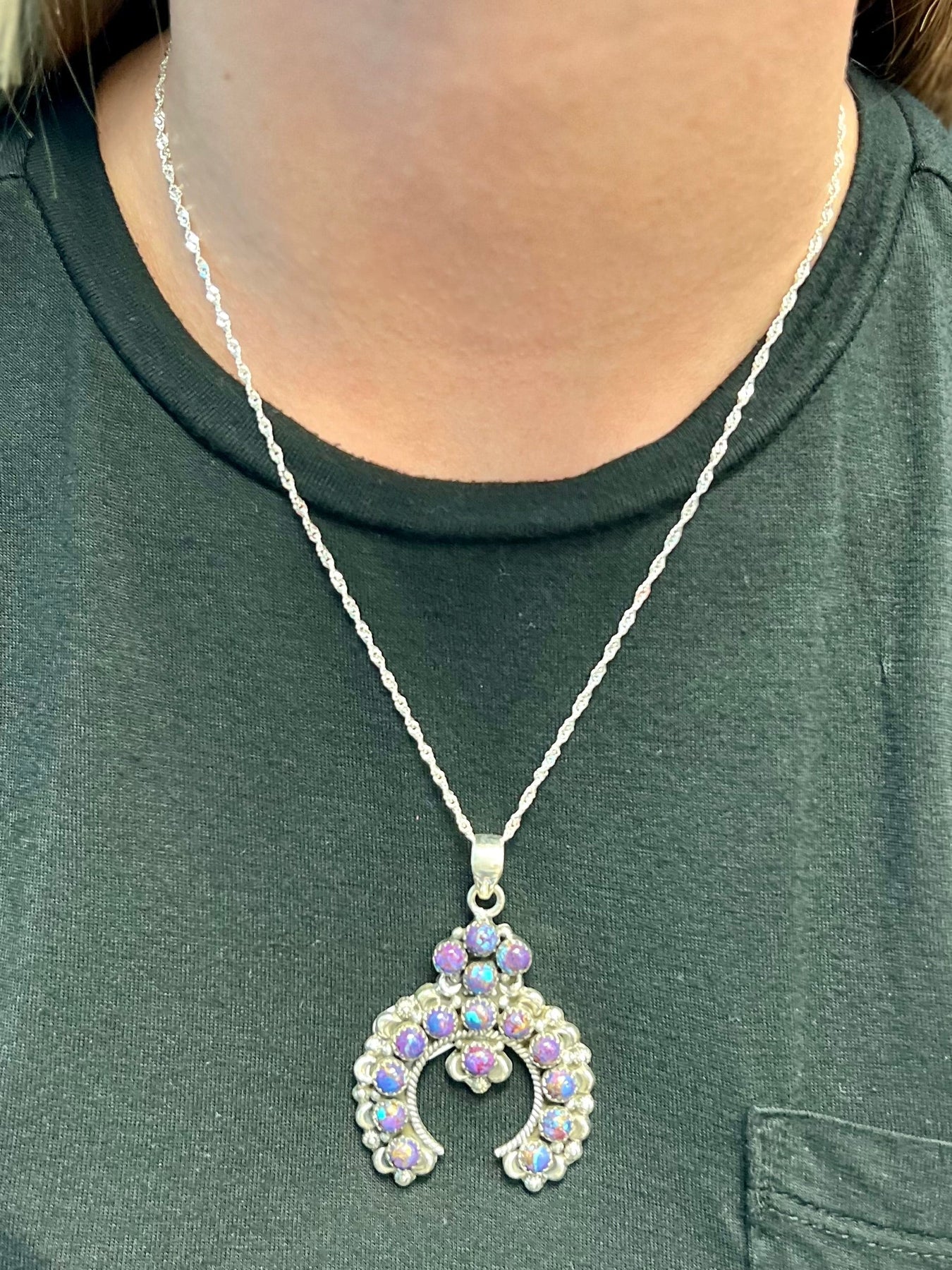 This unique piece of jewelry from the SS Purple Mojave Collection is a timeless piece crafted with luxurious details - made with sterling silver and a handcrafted Purple Mojave Squash Blossom pendant, this pendant is sure to exude sophistication and exclusivity. Perfect for any special occasion, this pendant is handmade by Navajo artisans from Gallup, New Mexico.