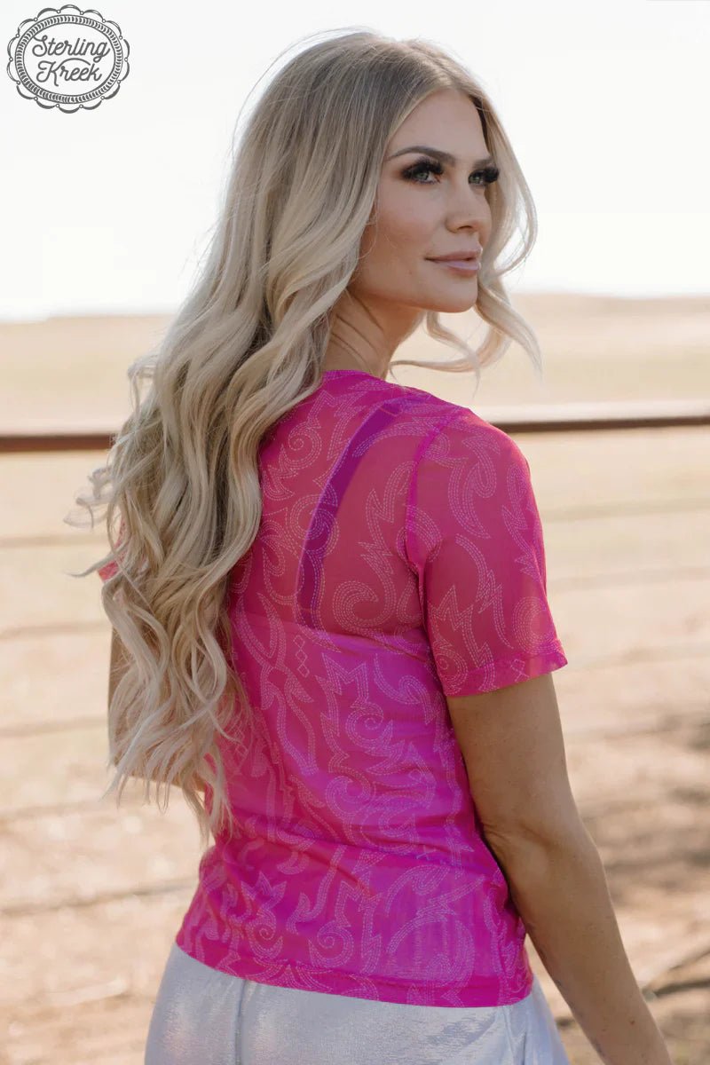 This pink plus mesh top is perfect for the wild and free gal! Show off your adventurous side with the cream boot stitching design, making you the trendsetter of the town. Let's go, girls! (No instructions revealed)