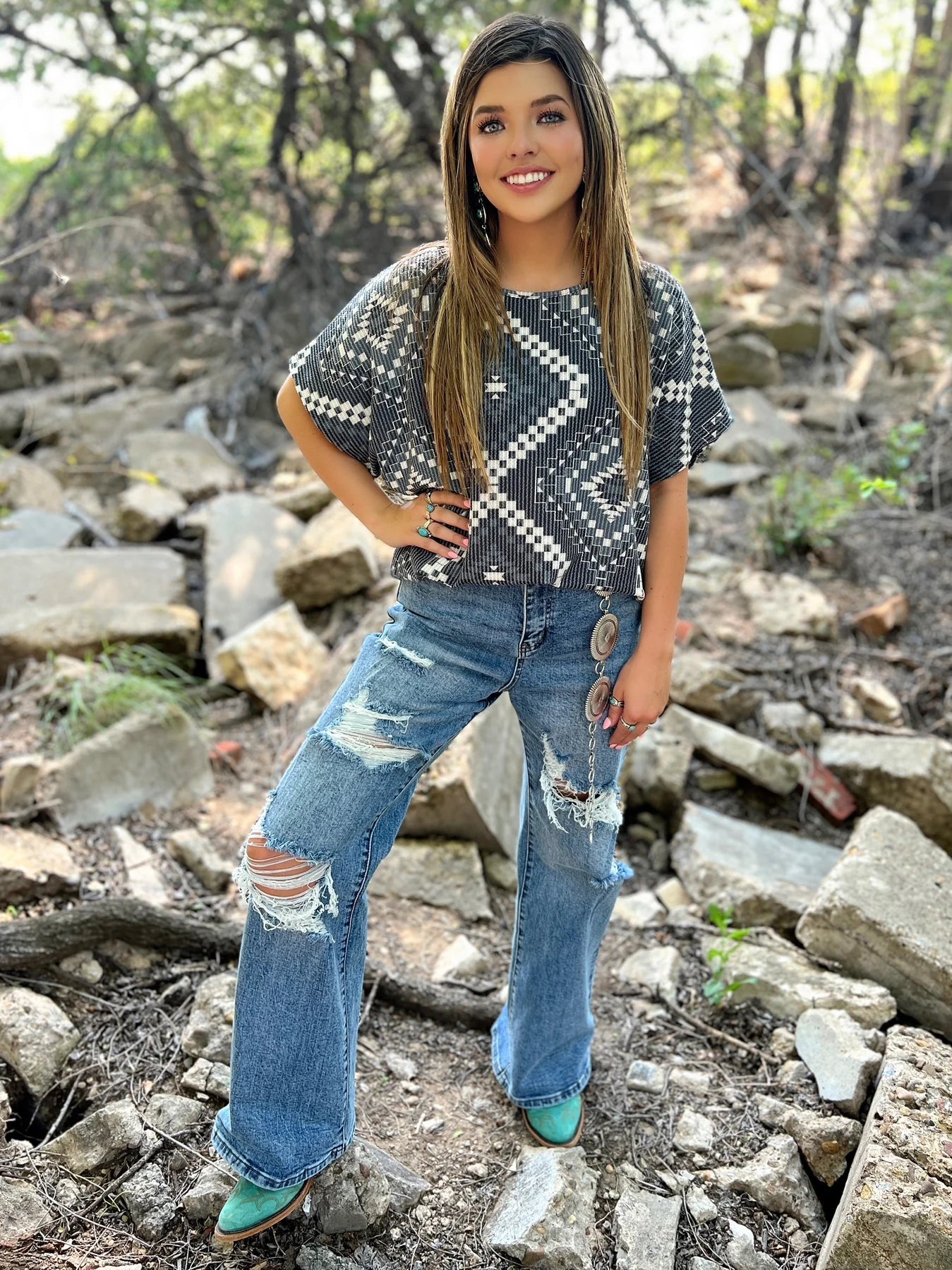 Embrace a slower pace with our PLUS Take It Slow Top. In a chic black, gray, and white Aztec design, this top offers an oversized fit for ultimate comfort. Perfect for laid-back days and cozy nights in. Slow and steady wins the style race with this top. (Pun intended).