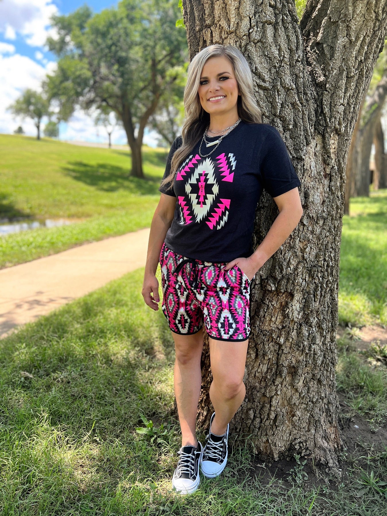 Get ready to hit the road with PLUS The Road To You tee! This black tee features a playful pink and white aztec design that is sure to turn heads. With its quirky style and comfortable fit, this tee is the perfect addition to any outfit. Let your personality shine and show off your unique style with The Road To You tee