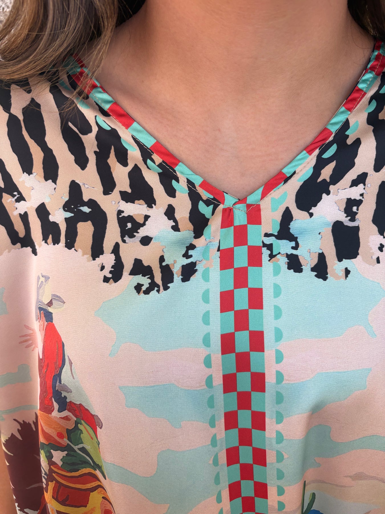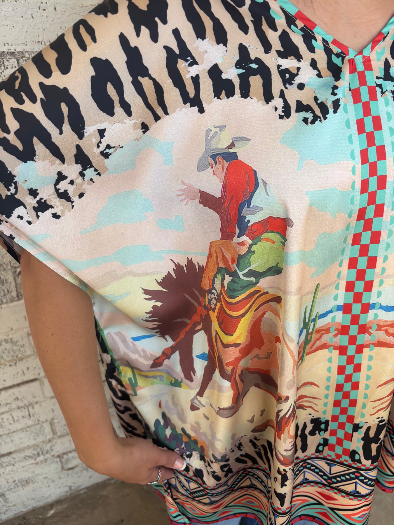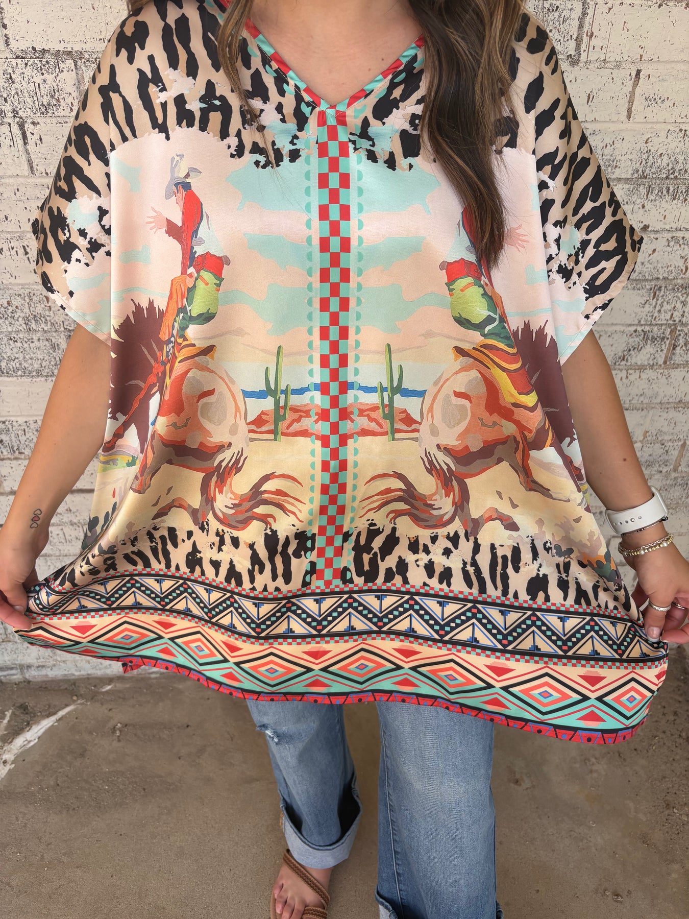 Step out in wild style with the 8 Second Ride Oversized Poncho! Featuring a bold mix of leopard print and Aztec patterns, this short-sleeve, V-neck poncho wraps you in playful comfort. Its roomy, oversized fit lets you move freely—perfect for channeling your inner bronc rider with a fun, fierce twist.