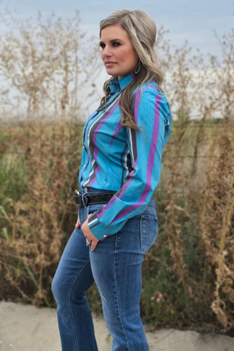 The Gotta Be Me Button Up features vibrant purple, blue, and black stripes, creating a bold and stylish look. Crafted with snap buttons for easy wear and a secure fit, this shirt brings effortless confidence to your everyday wardrobe. Perfect for making a statement, it combines distinctive color with practical design to keep you comfortable and confident all day.